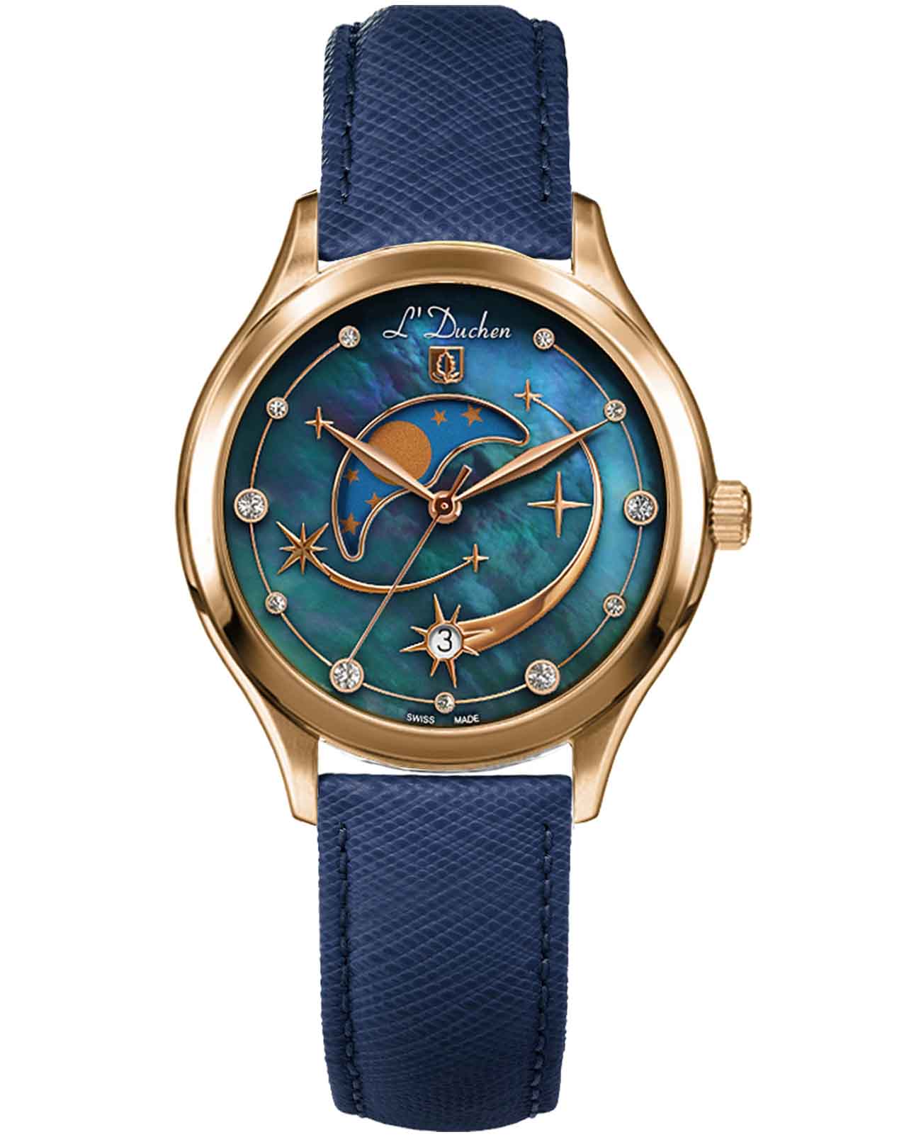 Женские швейцарские часы L'Duchen Perseides D 837.13.47, кварцевый механизм с высокой точностью. Сапфировое стеклоСапфировое стеклоПрочный и надёжный материал из кристалла сапфира синтетического происхождения, характеризующийся особой твёрдостью и устойчивостью к царапинам и повреждениям. устойчивое к появлению царапин, обладающее высокой прозрачностью. Корпус часов выполнен из нержавеющей стали. Циферблат украшен фианитами. Класс водозащиты: 50 метров, позволит защитить корпус от случайных брызг или капель дождя. Кожаный ремешок на застёжке «бабочка» с кнопкамиЗастёжка "бабочка"Такой вид застёжки дополняется предохранителями, помогающими избежать случайного раскрытия браслета. Обладают изящным исполнением. .