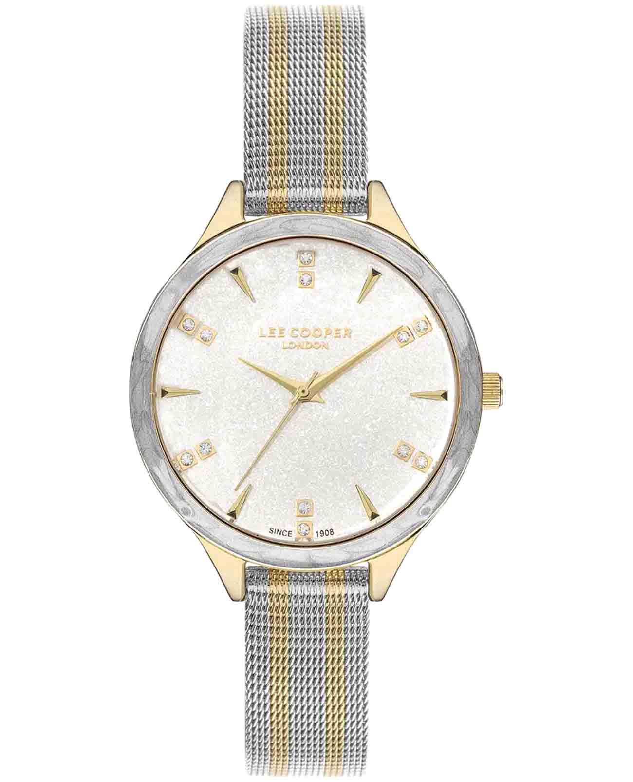 Женские наручные часы Lee Cooper LC07388.230 — это элегантная модель с утончённым дизайном. Корпус диаметром 34 мм выполнен из нержавеющей стали, что придаёт часам изысканный вид. Серебристый циферблат украшен изящными вставками из кристаллов и стрелками, обеспечивая удобное считывание времени. Циферблат защищён минеральным стекломМинеральное стеклоМинеральное стекло представляет собой искусственно выращенный минерал кварца. Такое стекло отличается особой устойчивостью к повреждениям и царапинам. Уступает по некоторым качествам сапфировому стеклу., устойчивым к царапинам. Часы работают на кварцевом механизме, обеспечивая точность хода. Браслет из нержавеющей стали с раскладной застёжкойРаскладная застёжкаТакой тип застёжки используется только на браслетах из металла. Она никогда не раскрывается полностью, происходит разделение на 2 и более частей. Раскладывающая застёжка снизит вероятность потери часов к минимуму. гарантирует комфортное ношение и надёжную фиксацию на запястье. БезельБезельВнешний ободок, закрепляющий стекло. В спортивных часах так называется поворотное кольцо с делениями на циферблате, выполняет роль таймера – замеряет отрезки времени на шкале. Неподвижный безель – элемент декора. Однонаправленно вращающийся безель на дайверских часах позволяет фиксировать моменты погружения и выныривания на поверхность. с IP-покрытиемIP-покрытиеМетод ионного напыления. Демонстрирует повышенную устойчивость к истиранию, окислению и химическим веществам. Под воздействием высокого давления и температуры около 1500°C молекулы металла надёжно соединяются с частицами корпуса часов.. Водозащита 30 метров защищает часы от случайных брызг и дождя, делая их подходящими для повседневного использования.