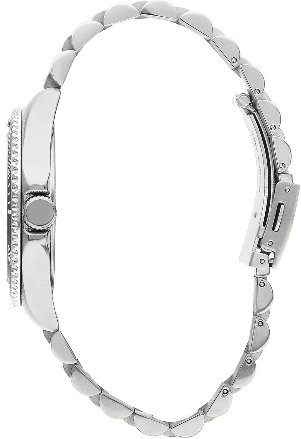 Женские часы Lee Cooper LC07593.350 — это стильное сочетание элегантности и современного дизайна. Круглый корпус диаметром 36 мм выполнен из суперметалла серебристого цвета. Циферблат защищен минеральным стекломМинеральное стеклоМинеральное стекло представляет собой искусственно выращенный минерал кварца. Такое стекло отличается особой устойчивостью к повреждениям и царапинам. Уступает по некоторым качествам сапфировому стеклу., обеспечивающий устойчивость к царапинам. Поворотный безельБезельВнешний ободок, закрепляющий стекло. В спортивных часах так называется поворотное кольцо с делениями на циферблате, выполняет роль таймера – замеряет отрезки времени на шкале. Неподвижный безель – элемент декора. Однонаправленно вращающийся безель на дайверских часах позволяет фиксировать моменты погружения и выныривания на поверхность. с IP-покрытиемIP-покрытиеМетод ионного напыления. Демонстрирует повышенную устойчивость к истиранию, окислению и химическим веществам. Под воздействием высокого давления и температуры около 1500°C молекулы металла надёжно соединяются с частицами корпуса часов. черного цвета. Центральные часовая, минутная и секундная стрелки. Часы оснащены надежным кварцевым механизмом, источник питания - батарейка. Металлический браслет на раскладной застёжкеРаскладная застёжкаТакой тип застёжки используется только на браслетах из металла. Она никогда не раскрывается полностью, происходит разделение на 2 и более частей. Раскладывающая застёжка снизит вероятность потери часов к минимуму. гарантирует комфортную посадку на запястье. Водозащита 30 метров защищает модель от случайных брызг и дождя. Стрелки с люминесцентным покрытиемЛюминесцентное покрытиеПозволяет считывать показания времени в темноте. Производители наносят на стрелки, часовые индексы, безель или поверхность циферблата светонакопительный состав, дающий холодное свечение. позволяющие легко определять время даже в темноте. Lee Cooper — отличный выбор для тех, кто ценит утонченность и качество.
