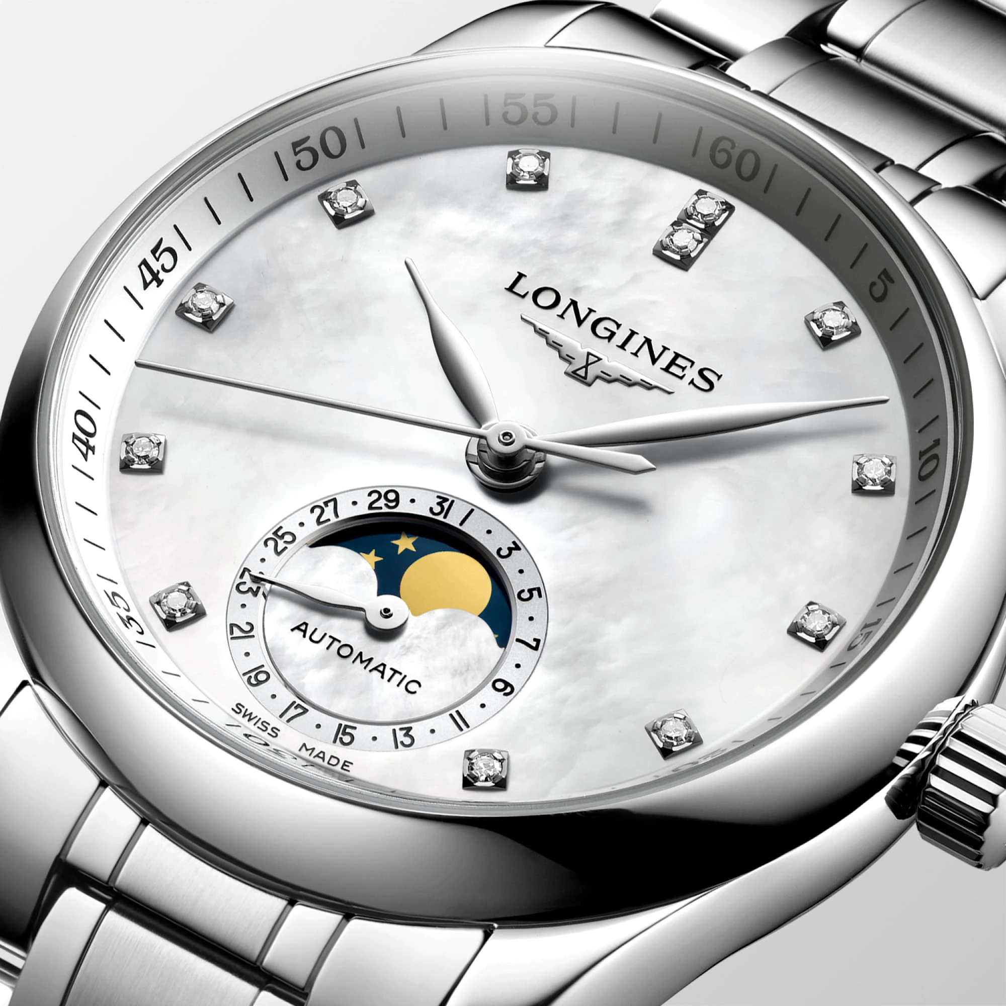 Женские швейцарские механические часы с автоподзаводом Longines Master Collection L2.409.4.87.6. Сапфировое стеклоСапфировое стеклоПрочный и надёжный материал из кристалла сапфира синтетического происхождения, характеризующийся особой твёрдостью и устойчивостью к царапинам и повреждениям. устойчивое к появлению царапин, обладающее высокой прозрачностью. Корпус часов изготовлен из нержавеющей стали. Циферблат с 12 бриллиантами группы Top Wesselton VS-SI общим весом 0.055 карата. Автоматический механизм с частотой баланса 25 200 полуколебаний в час и запасом хода, которого хватает примерно на 72 часа работы. Часы, минуты, секунды, маленький стрелочный указатель фаз Луны и даты в положении 6 часов. Прозрачная задняя крышка. Класс водозащиты: 30 метров, позволит защитить корпус от случайных брызг или капель дождя. Стальной браслет на застёжке «бабочка» с кнопкамиЗастёжка "бабочка"Такой вид застёжки дополняется предохранителями, помогающими избежать случайного раскрытия браслета. Обладают изящным исполнением. .