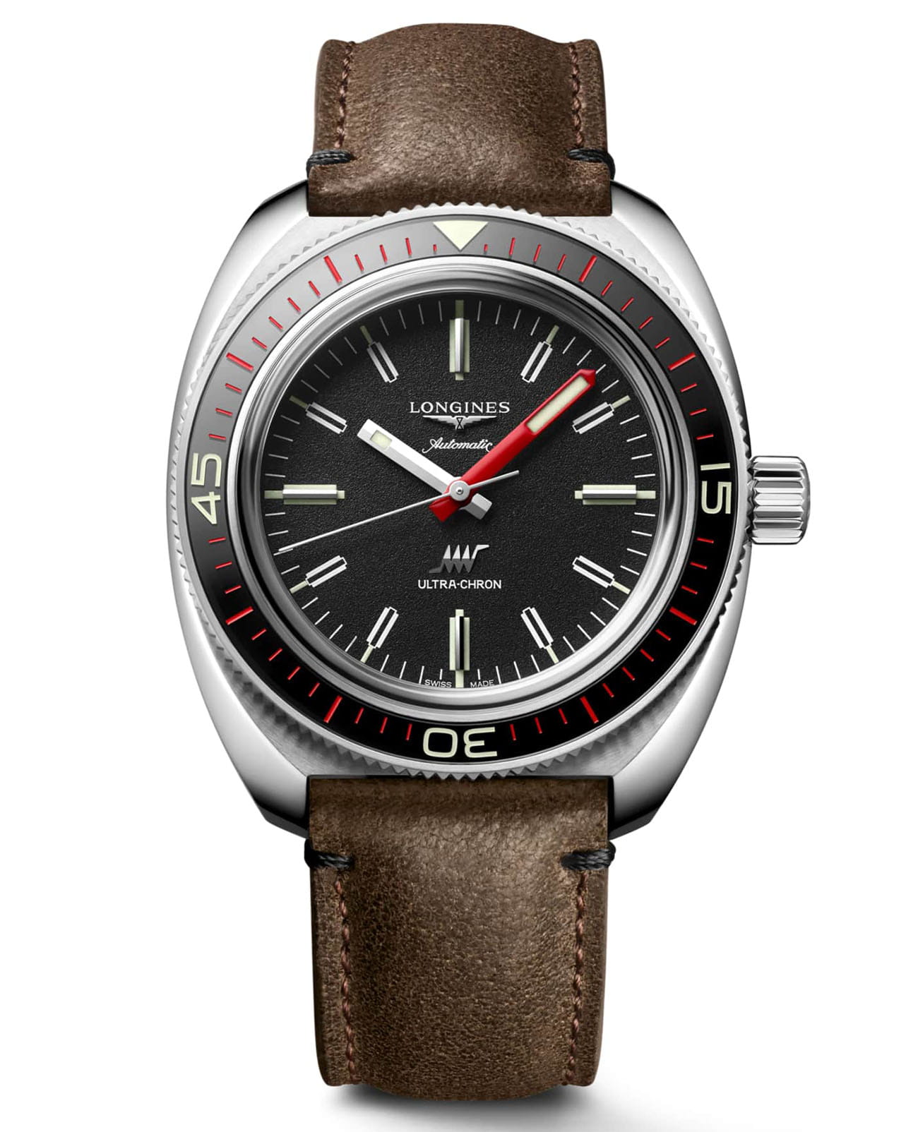 Мужские швейцарские механические часы Longines Ultra‑Chron Box Edition L2.836.4.52.8. Сапфировое стеклоСапфировое стеклоПрочный и надёжный материал из кристалла сапфира синтетического происхождения, характеризующийся особой твёрдостью и устойчивостью к царапинам и повреждениям. с антибликовым покрытием, устойчивое к мелким механическим повреждениям. БезелемБезельВнешний ободок, закрепляющий стекло. В спортивных часах так называется поворотное кольцо с делениями на циферблате, выполняет роль таймера – замеряет отрезки времени на шкале. Неподвижный безель – элемент декора. Однонаправленно вращающийся безель на дайверских часах позволяет фиксировать моменты погружения и выныривания на поверхность. с керамической вставкой. Стрелки и метки с люминесцентнымЛюминесцентное покрытиеПозволяет считывать показания времени в темноте. Производители наносят на стрелки, часовые индексы, безель или поверхность циферблата светонакопительный состав, дающий холодное свечение. покрытием. Запас хода до 52 часов. Класс водозащиты: 300 метров, позволит плавать, нырять и заниматься другими водными видами спорта. Кожаный ремешок на стандартной застежке. В комплект входят 2 ремешка: кожаный и черный ремешок НАТО, изготовленный из переработанного материала.