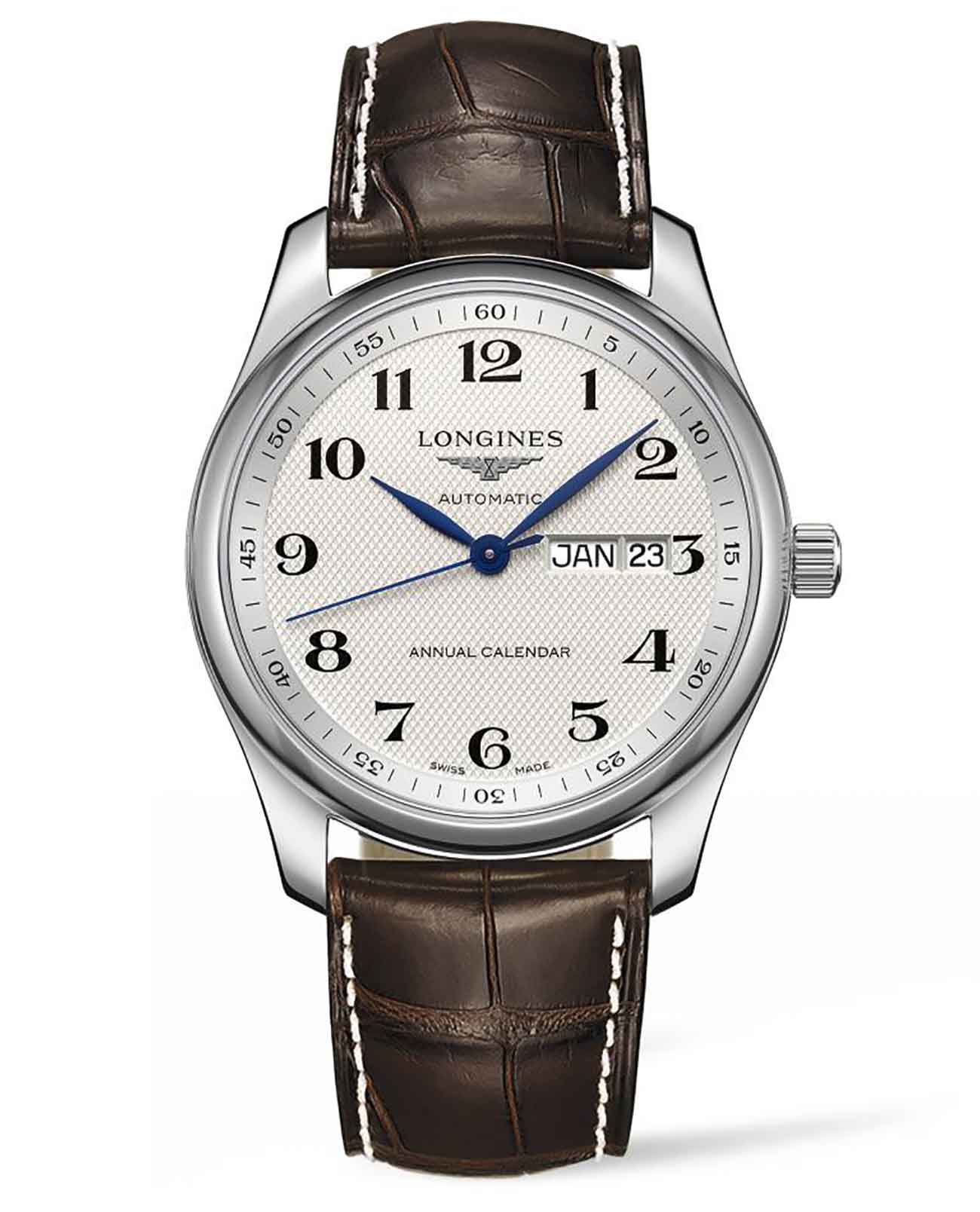 Циферблат с узором «barleycorn» отражает элегантный стиль. Внутри стального корпуса находится швейцарский автоматический механизм L897. Калибр отличается 64-часовым запасом хода и обеспечивает высокую точность показателей времени. Ремешок изготовлен из натуральной кожи аллигатора. Сапфировое стекло устойчиво к появлению царапин. Годовой календарь включает указатели месяца и дня недели.