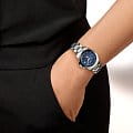 Компактный циферблат защищён от царапин сапфировым стеклом с антибликовой обработкойАнтибликовое покрытиеСлой оксида металла в 0,13-0,3 микрон, благодаря которому стекло часов не бликует и не отражает свет. Антибликовое покрытие уменьшает отражение света в 10 раз, обеспечивая отличную читаемость показателей циферблата. и украшен 11 бриллиантами общим весом 0.036 карата. Сохранять водостойкость до 30 бар помогают закручивающаяся задняя крышка и завинчивающаяся заводная головка. Швейцарский кварцевый калибр L296 обеспечивает высокую точность хода. Дополнительные усложнения: календарь, индикатор EOLEOLПредставляет собой систему, уведомляющую владельца часов о необходимости замены элемента питания. За 2 недели до полного разряда батарейки секундная стрелка перестаёт ходить чётко и начинает перепрыгивать на 3-4 деления., отображение фаз луны.