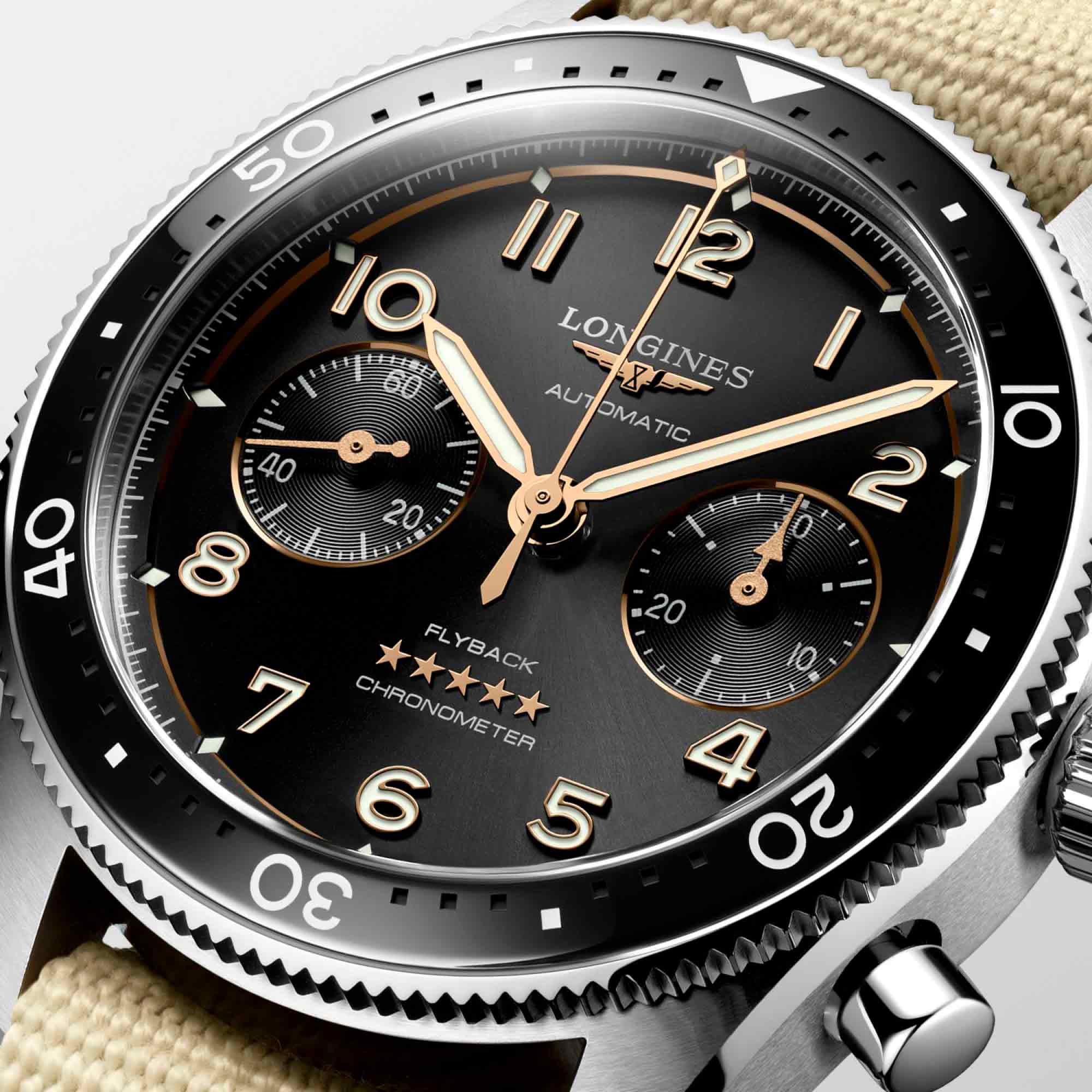 Мужские швейцарские механические часы Longines Spirit L3.821.4.53.9 – высокоточный хронометр в стильном дизайне. Спортивный хронографХронографФункция позволяет измерять отрезки времени с особой точностью: часы, минуты, секунды. Верным признаком хронографа является наличие на циферблате 3 дополнительных окошек-счётчиков. выпущен в честь известных авиаторов, которые раньше тестировали часы Longines. Модель оснащена швейцарским автоматическим механизмом, чрезвычайно точный механизм с запасом хода 68 часов сертифицирован COSCСертификат COSCОфициальный сертификат, подтверждающий то, что часы ходят с особо высокой точностью. Для получения документа часы подвергаются тестовым испытаниям, разработанным швейцарским институтом тестирования хронометров COSC. Допустимая норма для механических часов -4/+6 секунд в день, для кварцевых моделей +/- 0,07 секунд в день.. Дополнительные особенности: сапфировое стеклоСапфировое стеклоПрочный и надёжный материал из кристалла сапфира синтетического происхождения, характеризующийся особой твёрдостью и устойчивостью к царапинам и повреждениям. с двухсторонним антибликовым покрытиемАнтибликовое покрытиеСлой оксида металла в 0,13-0,3 микрон, благодаря которому стекло часов не бликует и не отражает свет. Антибликовое покрытие уменьшает отражение света в 10 раз, обеспечивая отличную читаемость показателей циферблата., люминесцентная подсветкаЛюминесцентное покрытиеПозволяет считывать показания времени в темноте. Производители наносят на стрелки, часовые индексы, безель или поверхность циферблата светонакопительный состав, дающий холодное свечение.. Он оснащен двунаправленным безелемБезельВнешний ободок, закрепляющий стекло. В спортивных часах так называется поворотное кольцо с делениями на циферблате, выполняет роль таймера – замеряет отрезки времени на шкале. Неподвижный безель – элемент декора. Однонаправленно вращающийся безель на дайверских часах позволяет фиксировать моменты погружения и выныривания на поверхность., дополненным керамической вставкой с люминесцентнымЛюминесцентное покрытиеПозволяет считывать показания времени в темноте. Производители наносят на стрелки, часовые индексы, безель или поверхность циферблата светонакопительный состав, дающий холодное свечение. метками и циферблатом в виде солнечных лучей. Класс водозащиты: 100 метров, позволит плавать, нырять и заниматься другими водными видами спорта. Текстильный ремешок на стандартной застежке.