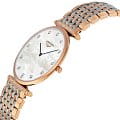 Белый перламутровый циферблат украшен 12 бриллиантами общим весом 0,081 карата.PVD-покрытиеPVDУльтратонкое покрытие наносится в технике вакуумного напыления, сочетает в себе нитрид титана особой прочности со слоем золота или оксида хрома. Несёт в себе декоративную или защитную функцию. устойчиво к царапинам и износу. Швейцарский кварцевый механизм L420 отличается абсолютной точностью хода. Стекло из сапфира устойчиво к царапинам. Водозащита – до 3 бар.