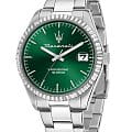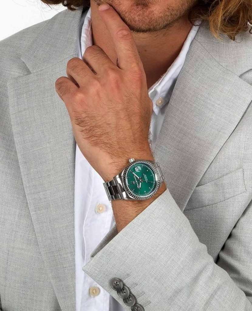 Часы Maserati Competizione R8853100043 отличаются стильным и современным дизайном, идеально подходящим для деловых и повседневных образов. Эти наручные часы оснащены надёжным кварцевым механизмом, который обеспечивает высокую точность показаний времени. Корпус часов диаметром 43 мм выполнен из прочной стали, что гарантирует долговечность и устойчивость к внешним воздействиям. Минеральное стеклоМинеральное стеклоМинеральное стекло представляет собой искусственно выращенный минерал кварца. Такое стекло отличается особой устойчивостью к повреждениям и царапинам. Уступает по некоторым качествам сапфировому стеклу. защищает зелёный циферблат, на котором расположены изящные риски, создавая элегантный и утончённый вид. Часы обладают водостойкостью до 100 метров (10 АТМ), что позволяет не беспокоиться о попадании влаги при плавании или занятиях водными видами спорта. Стальной браслет с раскладной застёжкойРаскладная застёжкаТакой тип застёжки используется только на браслетах из металла. Она никогда не раскрывается полностью, происходит разделение на 2 и более частей. Раскладывающая застёжка снизит вероятность потери часов к минимуму. не только обеспечивает комфортное ношение, но и придаёт аксессуару дополнительную элегантность, подчёркивая его современный стиль. Люминесцентное покрытиеЛюминесцентное покрытиеПозволяет считывать показания времени в темноте. Производители наносят на стрелки, часовые индексы, безель или поверхность циферблата светонакопительный состав, дающий холодное свечение. на стрелках обеспечивает отличную видимость в темноте, а окошко даты с днем недели, расположенное в позиции 3 часа, добавляет практичности. Эти часы станут отличным дополнением к вашему гардеробу, сочетая в себе функциональность и изысканный дизайн.