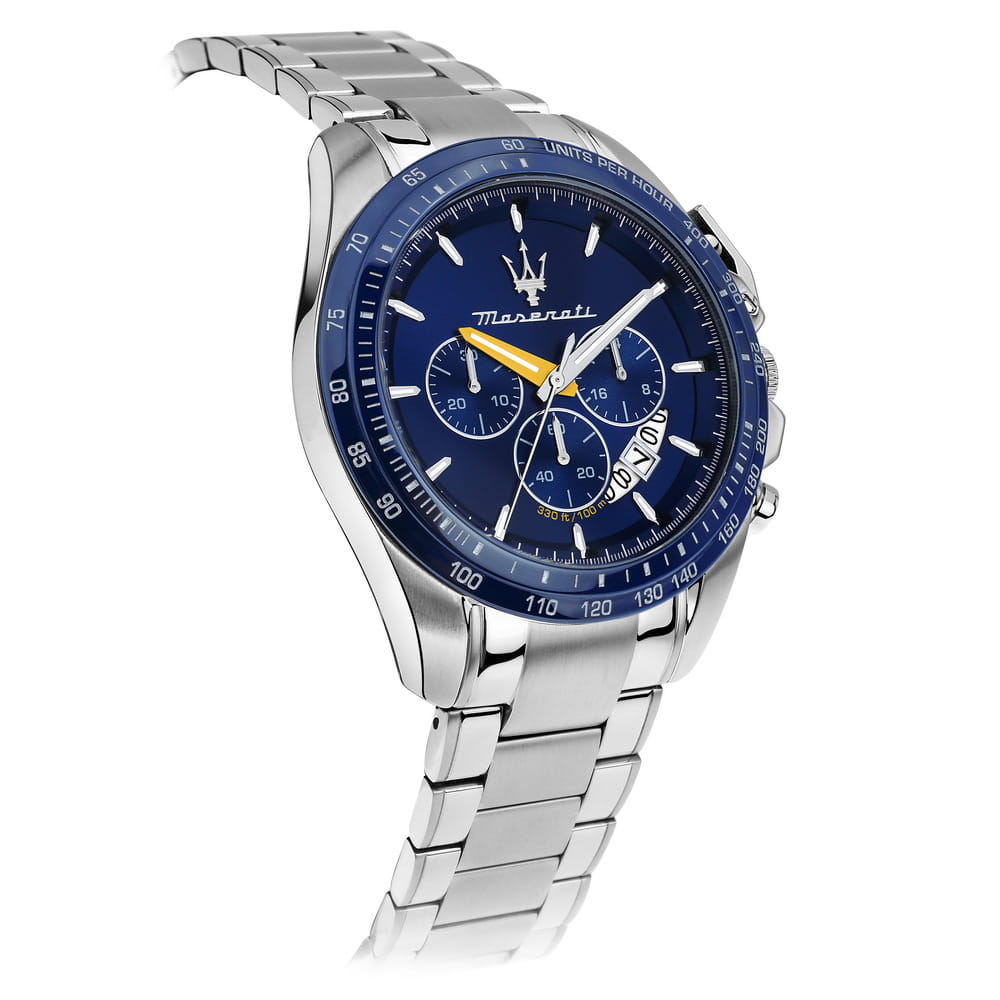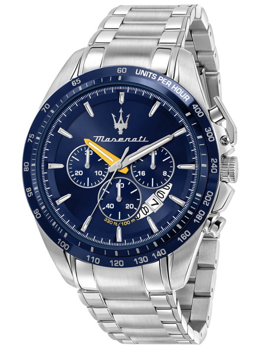 Мужские наручные часы-хронографХронографФункция позволяет измерять отрезки времени с особой точностью: часы, минуты, секунды. Верным признаком хронографа является наличие на циферблате 3 дополнительных окошек-счётчиков. Maserati R8871612039, кварцевый механизм с высокой точностью. Минеральное стеклоМинеральное стеклоМинеральное стекло представляет собой искусственно выращенный минерал кварца. Такое стекло отличается особой устойчивостью к повреждениям и царапинам. Уступает по некоторым качествам сапфировому стеклу. устойчивое к появлению царапин, обладающее высокой прозрачностью. Стрелки и метки с люминесцентным покрытиемЛюминесцентное покрытиеПозволяет считывать показания времени в темноте. Производители наносят на стрелки, часовые индексы, безель или поверхность циферблата светонакопительный состав, дающий холодное свечение.. Класс водозащиты: 100 метров, позволит плавать, нырять и заниматься другими водными видами спорта.БезельБезельВнешний ободок, закрепляющий стекло. В спортивных часах так называется поворотное кольцо с делениями на циферблате, выполняет роль таймера – замеряет отрезки времени на шкале. Неподвижный безель – элемент декора. Однонаправленно вращающийся безель на дайверских часах позволяет фиксировать моменты погружения и выныривания на поверхность. изготовлен из нержавеющей стали с PVD-покрытиемPVDУльтратонкое покрытие наносится в технике вакуумного напыления, сочетает в себе нитрид титана особой прочности со слоем золота или оксида хрома. Несёт в себе декоративную или защитную функцию..