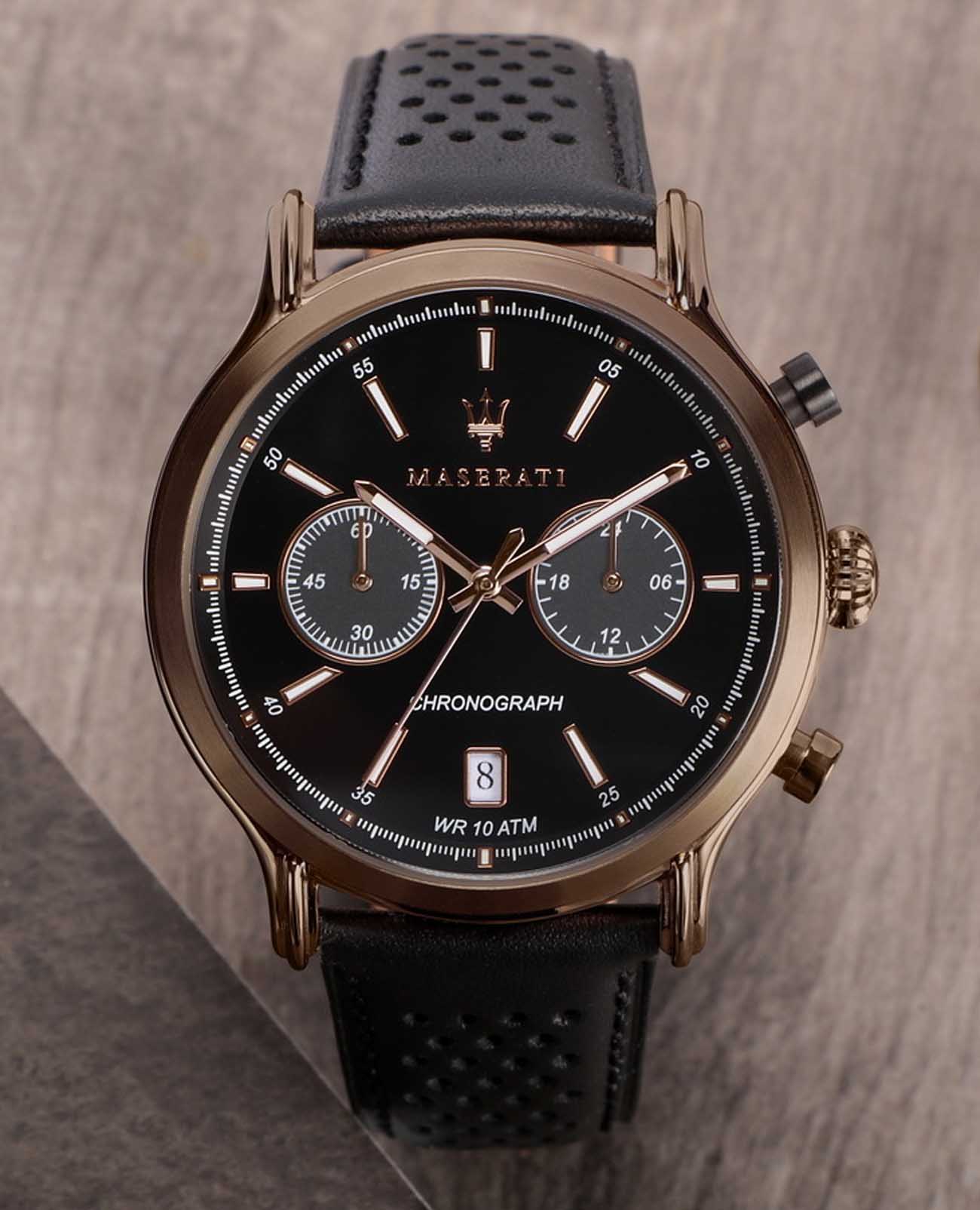 Мужские итальянские часы-хронографХронографФункция позволяет измерять отрезки времени с особой точностью: часы, минуты, секунды. Верным признаком хронографа является наличие на циферблате 3 дополнительных окошек-счётчиков. Maserati Legend R8871638001, кварцевый механизм с высокой точностью. Корпус часов изготовлен из стали с PVD-покрытиемPVDУльтратонкое покрытие наносится в технике вакуумного напыления, сочетает в себе нитрид титана особой прочности со слоем золота или оксида хрома. Несёт в себе декоративную или защитную функцию.. Стрелки с люминесцентным покрытиемЛюминесцентное покрытиеПозволяет считывать показания времени в темноте. Производители наносят на стрелки, часовые индексы, безель или поверхность циферблата светонакопительный состав, дающий холодное свечение.. Класс водозащиты: 100 метров, позволит плавать, нырять и заниматься другими водными видами спорта. Кожаный ремешок на стандартной застежке.