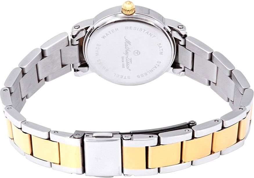 Женские кварцевые часы Mathey-Tissot City Metal D31186MBN — это стильное сочетание элегантности и современного дизайна. Изящный корпус выполнен из стали 316L с безелемБезельВнешний ободок, закрепляющий стекло. В спортивных часах так называется поворотное кольцо с делениями на циферблате, выполняет роль таймера – замеряет отрезки времени на шкале. Неподвижный безель – элемент декора. Однонаправленно вращающийся безель на дайверских часах позволяет фиксировать моменты погружения и выныривания на поверхность. с PVD-покрытиемPVDУльтратонкое покрытие наносится в технике вакуумного напыления, сочетает в себе нитрид титана особой прочности со слоем золота или оксида хрома. Несёт в себе декоративную или защитную функцию., что придаст образу женственности и романтизма. Изысканный циферблат с метками в виде штрихов придает модели особый блеск и защищен минеральным стекломМинеральное стеклоМинеральное стекло представляет собой искусственно выращенный минерал кварца. Такое стекло отличается особой устойчивостью к повреждениям и царапинам. Уступает по некоторым качествам сапфировому стеклу., обеспечивающим устойчивость к царапинам. Часы оснащены надежным кварцевым механизмом. Окошко даты находится в положении 3 часа. Стальной браслет с частичным PVD-покрытиемPVDУльтратонкое покрытие наносится в технике вакуумного напыления, сочетает в себе нитрид титана особой прочности со слоем золота или оксида хрома. Несёт в себе декоративную или защитную функцию.  на раскладной застёжкеРаскладная застёжкаТакой тип застёжки используется только на браслетах из металла. Она никогда не раскрывается полностью, происходит разделение на 2 и более частей. Раскладывающая застёжка снизит вероятность потери часов к минимуму., гарантирующего комфортное и безопасное ношение. Класс водозащиты: 50 метров позволит защитить корпус от случайных брызг или капель дождя. Mathey-Tissot  — отличный выбор для тех, кто ценит утонченность и качество.