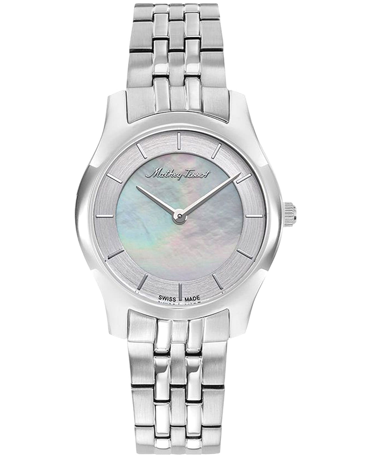 Женские кварцевые часы Mathey-Tissot Tacy D949AI— это стильное сочетание элегантности и современного дизайна. Изящный корпус выполнен из стали 316L  и прекрасно впишется в ваш исключительный стиль. Изысканный циферблат с метками придает модели особый блеск и защищен минеральным стекломМинеральное стеклоМинеральное стекло представляет собой искусственно выращенный минерал кварца. Такое стекло отличается особой устойчивостью к повреждениям и царапинам. Уступает по некоторым качествам сапфировому стеклу., обеспечивающим устойчивость к царапинам. Перламутровый циферблат. Заостренные прямоугольные стрелки в стиле Baton. Часы оснащены надежным кварцевым механизмом. Стальной браслет на раскладной застёжкеРаскладная застёжкаТакой тип застёжки используется только на браслетах из металла. Она никогда не раскрывается полностью, происходит разделение на 2 и более частей. Раскладывающая застёжка снизит вероятность потери часов к минимуму. гарантирует комфортное и безопасное ношение. Класс водозащиты: 50 метров позволит защитить корпус от случайных брызг или капель дождя. Mathey-Tissot  — отличный выбор для тех, кто ценит утонченность и качество.
