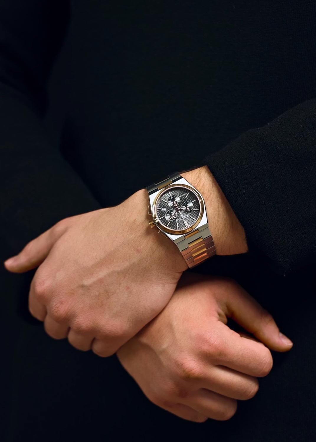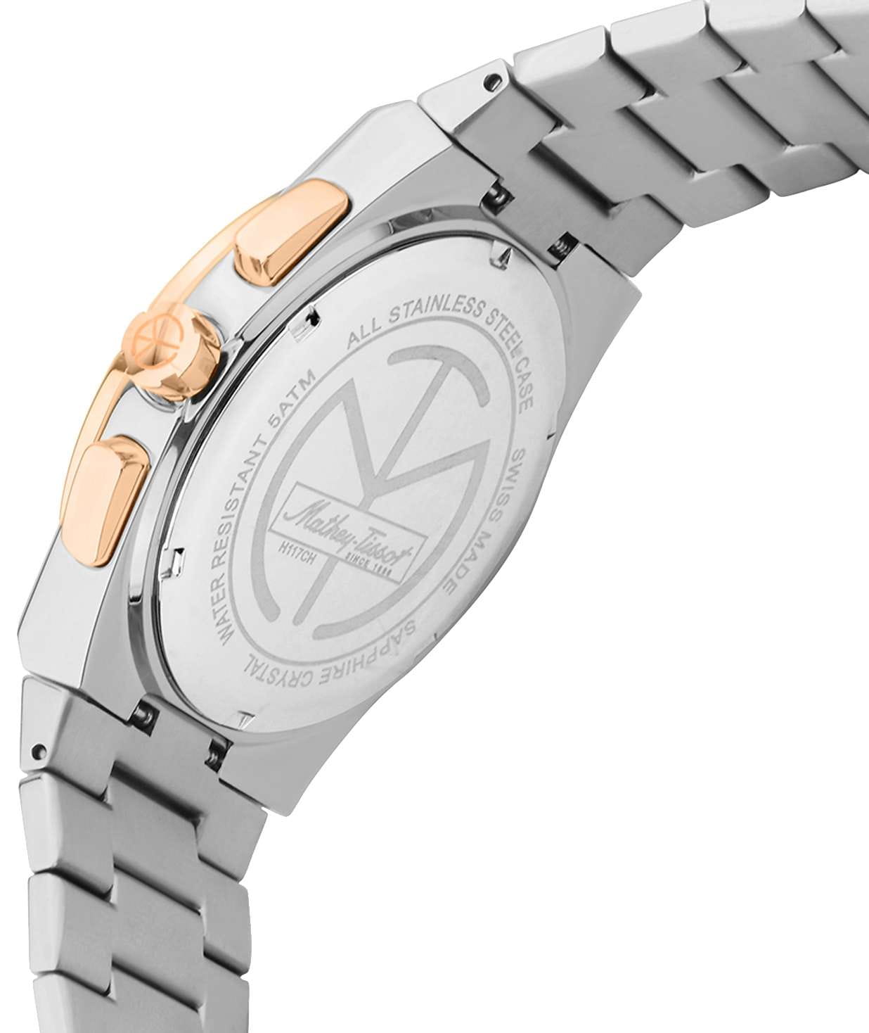 Мужские кварцевые часы-хронографХронографФункция позволяет измерять отрезки времени с особой точностью: часы, минуты, секунды. Верным признаком хронографа является наличие на циферблате 3 дополнительных окошек-счётчиков. Mathey-Tissot Zoltan H117CHSK — это стильное сочетание элегантности и современного дизайна. Изящный корпус выполнен из нержавеющей стали, диаметром 42 мм, что придаст образу элегантности и надежности. Изысканный циферблат с метками в виде штрихов придает модели особый блеск. Циферблат защищен сапфировым стекломСапфировое стеклоПрочный и надёжный материал из кристалла сапфира синтетического происхождения, характеризующийся особой твёрдостью и устойчивостью к царапинам и повреждениям., обеспечивающий устойчивость к царапинам. Неподвижный безельБезельВнешний ободок, закрепляющий стекло. В спортивных часах так называется поворотное кольцо с делениями на циферблате, выполняет роль таймера – замеряет отрезки времени на шкале. Неподвижный безель – элемент декора. Однонаправленно вращающийся безель на дайверских часах позволяет фиксировать моменты погружения и выныривания на поверхность. с PVD-покрытиемPVDУльтратонкое покрытие наносится в технике вакуумного напыления, сочетает в себе нитрид титана особой прочности со слоем золота или оксида хрома. Несёт в себе декоративную или защитную функцию. цвета розового золота. Стрелки и метки с люминесцентным покрытиемЛюминесцентное покрытиеПозволяет считывать показания времени в темноте. Производители наносят на стрелки, часовые индексы, безель или поверхность циферблата светонакопительный состав, дающий холодное свечение.. Окошко даты находится в положении 4 часа. Часы оснащены надежным кварцевым механизмом. Стальной браслет с частичным PVD-покрытиемPVDУльтратонкое покрытие наносится в технике вакуумного напыления, сочетает в себе нитрид титана особой прочности со слоем золота или оксида хрома. Несёт в себе декоративную или защитную функцию. на застёжке-бабочке с кнопкамиЗастёжка "бабочка"Такой вид застёжки дополняется предохранителями, помогающими избежать случайного раскрытия браслета. Обладают изящным исполнением. , гарантирует комфортное и безопасное ношение. Класс водозащиты: 50 метров позволит защитить корпус от случайных брызг или капель дождя. Mathey-Tissot  — отличный выбор для тех, кто ценит утонченность и качество.