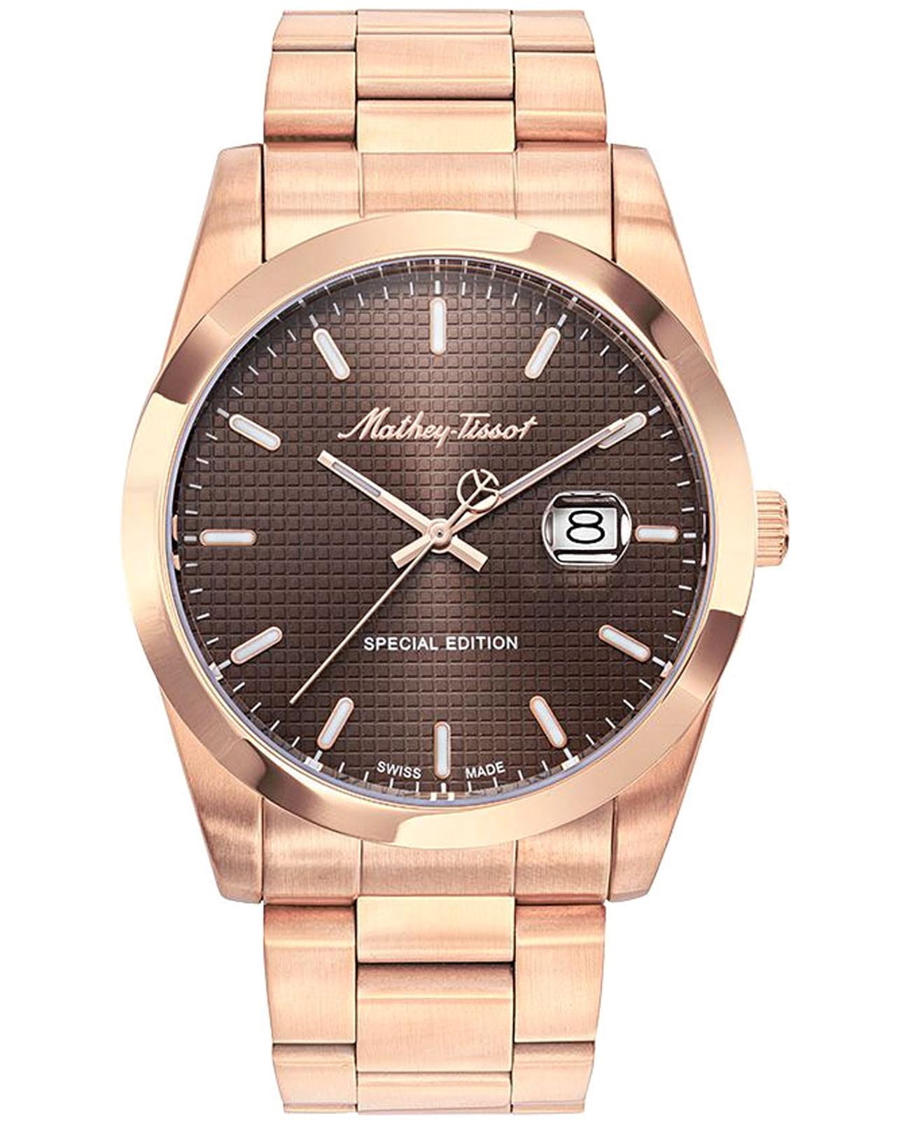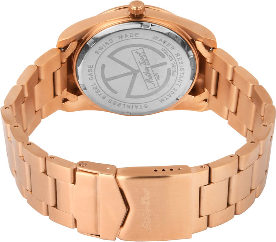 Мужские кварцевые часы Mathey-Tissot Mathy H452PRM — это стильное сочетание элегантности и современного дизайна. Изящный корпус выполнен из нержавеющей стали с PVD-покрытиемPVDУльтратонкое покрытие наносится в технике вакуумного напыления, сочетает в себе нитрид титана особой прочности со слоем золота или оксида хрома. Несёт в себе декоративную или защитную функцию. цвета розового золота, диаметром 42 мм, что придаст образу элегантности и надежности. Изысканный циферблат с метками в виде штрихов придает модели особый блеск. Циферблат защищен минеральным стекломМинеральное стеклоМинеральное стекло представляет собой искусственно выращенный минерал кварца. Такое стекло отличается особой устойчивостью к повреждениям и царапинам. Уступает по некоторым качествам сапфировому стеклу., обеспечивает устойчивость к царапинам. Стрелки и метки с люминесцентным покрытиемЛюминесцентное покрытиеПозволяет считывать показания времени в темноте. Производители наносят на стрелки, часовые индексы, безель или поверхность циферблата светонакопительный состав, дающий холодное свечение.. Окошко даты находится в положении 3 часа. Часы оснащены надежным кварцевым механизмом. Стальной браслет с PVD-покрытиемPVDУльтратонкое покрытие наносится в технике вакуумного напыления, сочетает в себе нитрид титана особой прочности со слоем золота или оксида хрома. Несёт в себе декоративную или защитную функцию. на раскладной застёжке с фиксаторомРаскладная застёжкаТакой тип застёжки используется только на браслетах из металла. Она никогда не раскрывается полностью, происходит разделение на 2 и более частей. Раскладывающая застёжка снизит вероятность потери часов к минимуму., гарантирует комфортное и безопасное ношение. Рифленая заводная головка. Класс водозащиты: 200 метров, позволит плавать нырять и заниматься другими водными видами спорта. Mathey-Tissot  — отличный выбор для тех, кто ценит утонченность и качество.