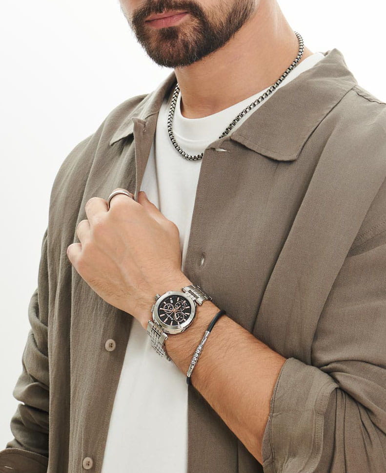 Мужские кварцевые часы-хронографХронографФункция позволяет измерять отрезки времени с особой точностью: часы, минуты, секунды. Верным признаком хронографа является наличие на циферблате 3 дополнительных окошек-счётчиков. Mathey-Tissot Neptune H912CHRRN — это стильное сочетание элегантности и современного дизайна. Изящный корпус выполнен из нержавеющей стали серебристого цвета, диаметром 42 мм, что придаст образу элегантности и надежности. Изысканный циферблат с метками в виде штрихов придает модели особый блеск. Циферблат защищен минеральным стекломМинеральное стеклоМинеральное стекло представляет собой искусственно выращенный минерал кварца. Такое стекло отличается особой устойчивостью к повреждениям и царапинам. Уступает по некоторым качествам сапфировому стеклу. с сапфировым покрытием, обеспечивает устойчивость к царапинам. Стрелки и метки с люминесцентным покрытиемЛюминесцентное покрытиеПозволяет считывать показания времени в темноте. Производители наносят на стрелки, часовые индексы, безель или поверхность циферблата светонакопительный состав, дающий холодное свечение.. БезельБезельВнешний ободок, закрепляющий стекло. В спортивных часах так называется поворотное кольцо с делениями на циферблате, выполняет роль таймера – замеряет отрезки времени на шкале. Неподвижный безель – элемент декора. Однонаправленно вращающийся безель на дайверских часах позволяет фиксировать моменты погружения и выныривания на поверхность. украшен винтами. Окошко даты находится в положении 4 часа. Часы оснащены надежным кварцевым механизмом. Стальной браслет на застёжке-бабочке с кнопкамиЗастёжка "бабочка"Такой вид застёжки дополняется предохранителями, помогающими избежать случайного раскрытия браслета. Обладают изящным исполнением. , гарантирует комфортное и безопасное ношение. Класс водозащиты: 50 метров позволит защитить корпус от случайных брызг или капель дождя. Mathey-Tissot  — отличный выбор для тех, кто ценит утонченность и качество.