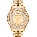 Женские американские часы с минеральным стекломМинеральное стеклоМинеральное стекло представляет собой искусственно выращенный минерал кварца. Такое стекло отличается особой устойчивостью к повреждениям и царапинам. Уступает по некоторым качествам сапфировому стеклу. Michael Kors Harlowe MK4709, кварцевый механизм с высокой точностью. Корпус и браслет часов изготовлены из нержавеющей стали с PVD-покрытиемPVDУльтратонкое покрытие наносится в технике вакуумного напыления, сочетает в себе нитрид титана особой прочности со слоем золота или оксида хрома. Несёт в себе декоративную или защитную функцию.. Циферблат, и безельБезельВнешний ободок, закрепляющий стекло. В спортивных часах так называется поворотное кольцо с делениями на циферблате, выполняет роль таймера – замеряет отрезки времени на шкале. Неподвижный безель – элемент декора. Однонаправленно вращающийся безель на дайверских часах позволяет фиксировать моменты погружения и выныривания на поверхность. украшены кристаллами. Метки в виде штрихов и римских цифр. Заводная головка с защитой. Класс водозащиты: 50 метров, позволит защитить корпус от случайных брызг или капель дождя. Стальной браслет на раскладной застёжкеРаскладная застёжкаТакой тип застёжки используется только на браслетах из металла. Она никогда не раскрывается полностью, происходит разделение на 2 и более частей. Раскладывающая застёжка снизит вероятность потери часов к минимуму..