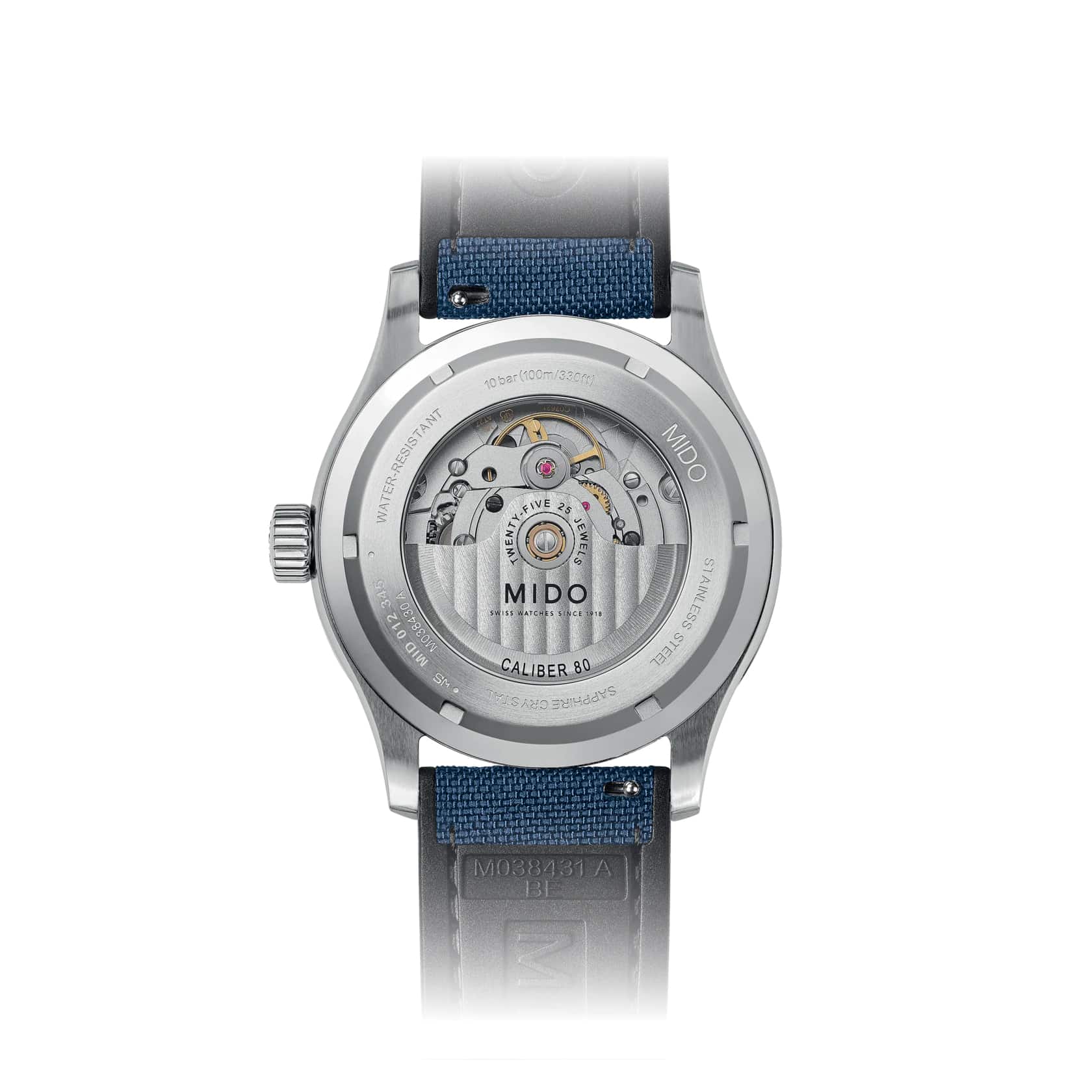 Вертикальная атласная отделка градиентного циферблата Multifort M напоминает о характерных чертах коллекции Côtes de Genève. Безупречное люминесцентное покрытиеЛюминесцентное покрытиеПозволяет считывать показания времени в темноте. Производители наносят на стрелки, часовые индексы, безель или поверхность циферблата светонакопительный состав, дающий холодное свечение. Super-LumiNova® создает контраст и читаемость на стрелках и круглых указателях. Легендарная надежность Multifort соответствует ритму знаменитого калибра 80. Запас хода до 80 часов обеспечивается Nivachron™Nivachron™Специально разработанный инновационный сплав Nivachron™ повышает устойчивость часов к воздействию магнитных полей. – революционного материала, обеспечивающего потрясающую точность. Mido предлагает Multifort M с системой смены ремня без инструментов, в стальном или текстильном исполнении на резиновой основе.