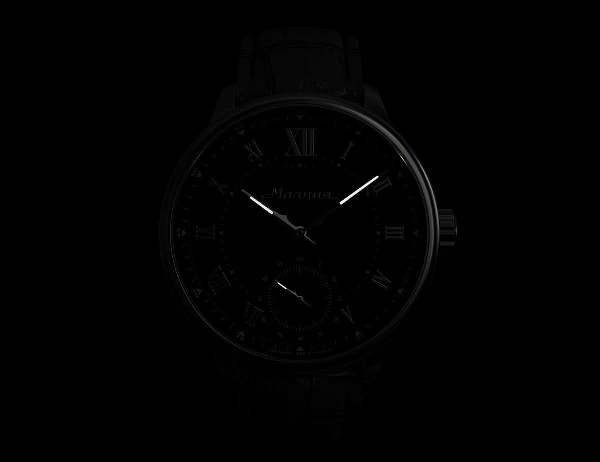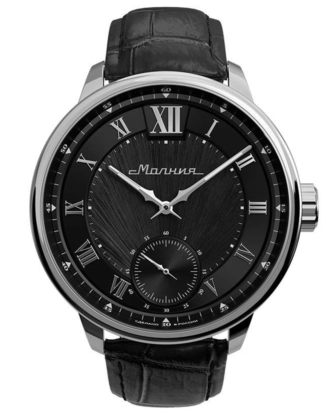 Мужские механические часы с ручным подзаводом — это аксессуар от легендарного бренда «МОЛНИЯ», созданный на Челябинском часовом заводе. Корпус диаметром 41 мм и толщиной 12 мм выполнен из нержавеющей стали 316L с зеркальной полировкой. БезельБезельВнешний ободок, закрепляющий стекло. В спортивных часах так называется поворотное кольцо с делениями на циферблате, выполняет роль таймера – замеряет отрезки времени на шкале. Неподвижный безель – элемент декора. Однонаправленно вращающийся безель на дайверских часах позволяет фиксировать моменты погружения и выныривания на поверхность. также выполнен из стали с зеркальной отделкой. Циферблат чёрного цвета оформлен римскими цифрами и стальными индексами. Малая секундная стрелка вынесена на позицию 6 часов. Циферблат защищён сапфировым стекломСапфировое стеклоПрочный и надёжный материал из кристалла сапфира синтетического происхождения, характеризующийся особой твёрдостью и устойчивостью к царапинам и повреждениям. толщиной 2,5 мм. Механизм — мануфактурный калибр 3603, собранный вручную, с запасом хода до 40 часов. Прозрачная задняя крышка позволяет наблюдать за работой механизма. Часы оснащены чёрным кожаным ремешком шириной 20 мм с раскладной застёжкойРаскладная застёжкаТакой тип застёжки используется только на браслетах из металла. Она никогда не раскрывается полностью, происходит разделение на 2 и более частей. Раскладывающая застёжка снизит вероятность потери часов к минимуму. и системой быстрой замены. Водонепроницаемость 100 м позволяет использовать часы для плавания и повседневного ношения. Идеальный выбор для тех, кто ценит российское качество и традиции.
