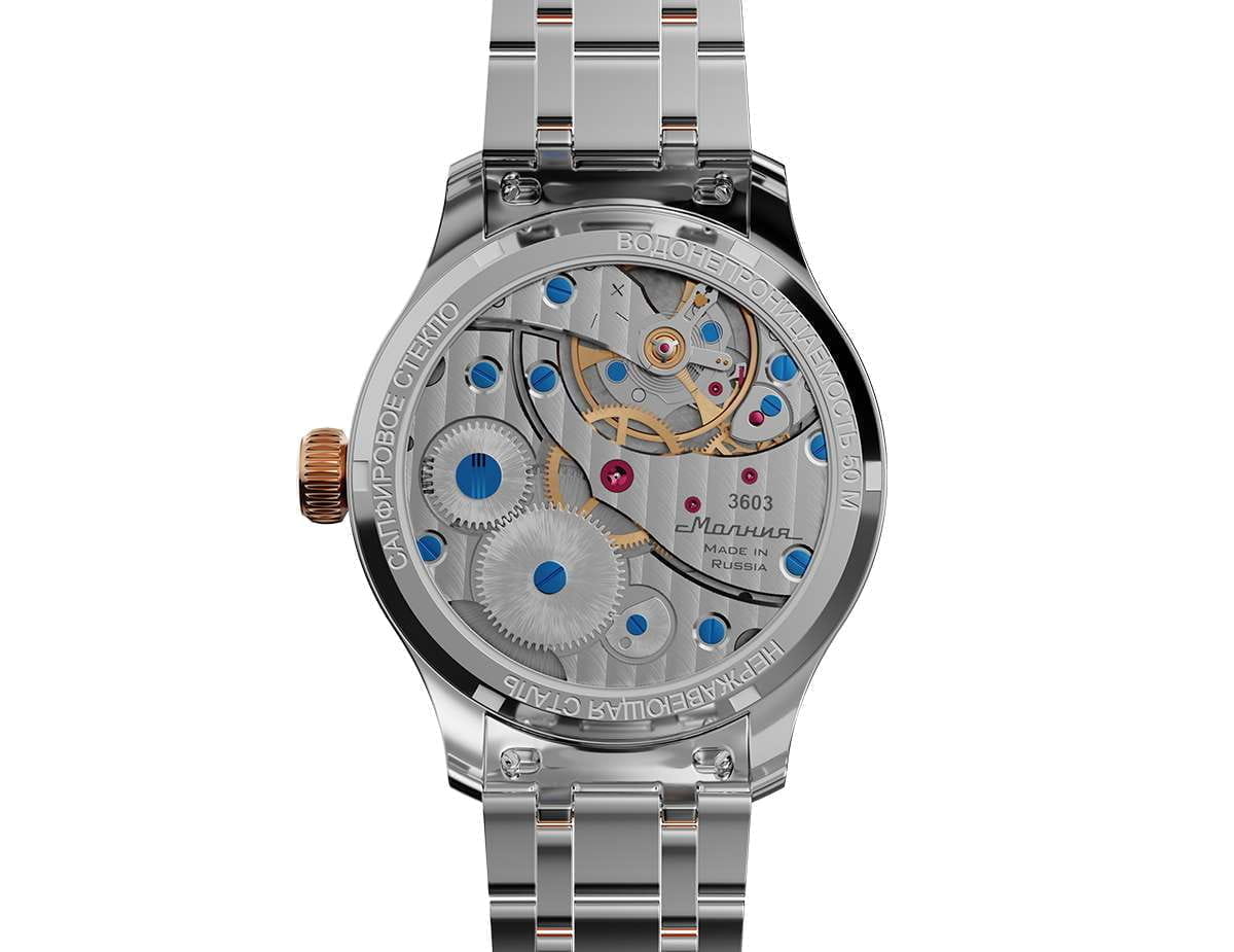 Мужские механические часы с ручным подзаводом — это аксессуар от легендарного бренда «МОЛНИЯ», созданный на Челябинском часовом заводе. Корпус диаметром 41 мм выполнен из нержавеющей стали 316L. БезельБезельВнешний ободок, закрепляющий стекло. В спортивных часах так называется поворотное кольцо с делениями на циферблате, выполняет роль таймера – замеряет отрезки времени на шкале. Неподвижный безель – элемент декора. Однонаправленно вращающийся безель на дайверских часах позволяет фиксировать моменты погружения и выныривания на поверхность. выполнен из стали с PVD-покрытиемPVDУльтратонкое покрытие наносится в технике вакуумного напыления, сочетает в себе нитрид титана особой прочности со слоем золота или оксида хрома. Несёт в себе декоративную или защитную функцию. и зеркальной отделкой. Циферблат синего цвета оформлен индексами и стрелками. Малая секундная стрелка вынесена на позицию 9 часов. Циферблат защищён сапфировым стекломСапфировое стеклоПрочный и надёжный материал из кристалла сапфира синтетического происхождения, характеризующийся особой твёрдостью и устойчивостью к царапинам и повреждениям. толщиной 2 мм. Механизм — мануфактурный калибр 3603, собранный вручную, с запасом хода до 40 часов. Прозрачная задняя крышка позволяет наблюдать за работой механизма. Часы оснащены стальным браслетом с частичным PVD-покрытиемPVDУльтратонкое покрытие наносится в технике вакуумного напыления, сочетает в себе нитрид титана особой прочности со слоем золота или оксида хрома. Несёт в себе декоративную или защитную функцию. под золото и системой быстрой замены на раскладной застёжкеРаскладная застёжкаТакой тип застёжки используется только на браслетах из металла. Она никогда не раскрывается полностью, происходит разделение на 2 и более частей. Раскладывающая застёжка снизит вероятность потери часов к минимуму. типа клипса. Водонепроницаемость 50 м позволяет использовать часы в повседневных условиях. Идеальный выбор для тех, кто ценит российское качество и традиции.