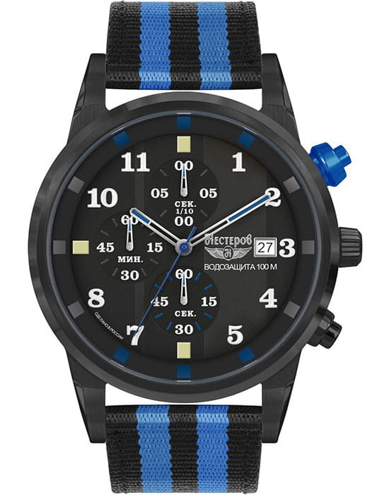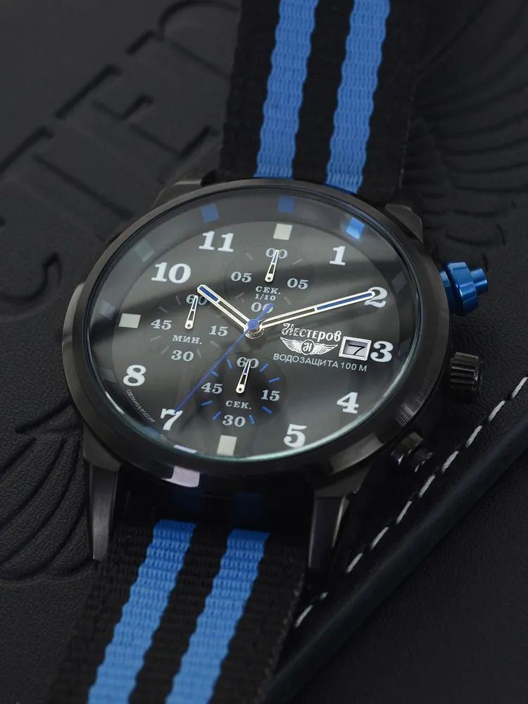 Ремешок выполнен из прочного нейлона в чёрно-синей цветовой гамме, обеспечивая комфорт при носке и добавляя модели спортивный характер.  Толщина корпуса составляет 10 мм, что придаёт часам солидный вид.