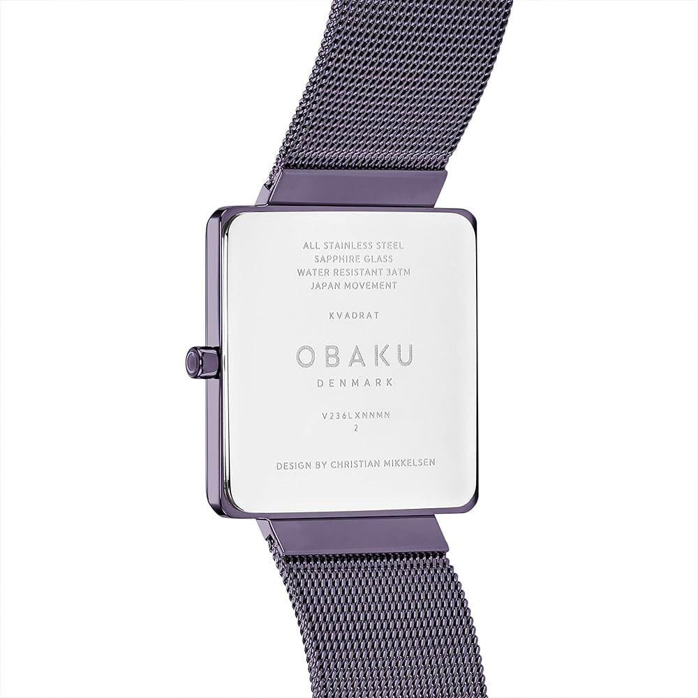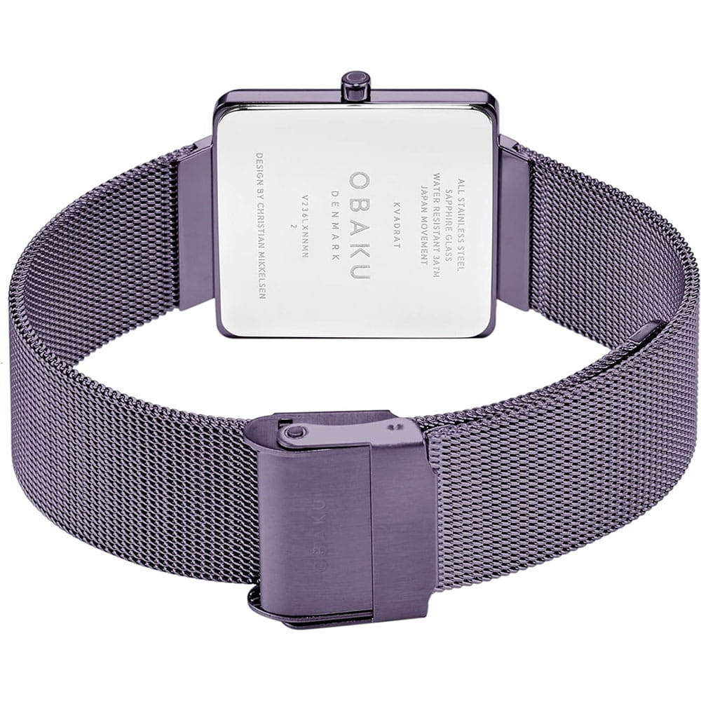 Женские наручные часы Obaku Kvadrat V236LXNNMN кварцевый механизм с высокой точностью, настоящее воплощение элегантности и утонченности. Их дизайн завораживает с первого взгляда, сочетая в себе классическую лаконичность и современные акценты. Сапфировое стеклоСапфировое стеклоПрочный и надёжный материал из кристалла сапфира синтетического происхождения, характеризующийся особой твёрдостью и устойчивостью к царапинам и повреждениям. защищает циферблат от царапин, обеспечивает отличную читаемость при любом освещении и устойчивое к мелким механическим повреждениям. Корпус выполнен из нержавеющей стали с IP-покрытиемIP-покрытиеМетод ионного напыления. Демонстрирует повышенную устойчивость к истиранию, окислению и химическим веществам. Под воздействием высокого давления и температуры около 1500°C молекулы металла надёжно соединяются с частицами корпуса часов. фиолетового цвета, размером 28 х 28 мм, толщина 4,7 мм, идеально сбалансирован и элегантен. Класс водозащиты: 30 метров позволит защитить корпус от случайных брызг или капель дождя. Стальной браслет миланского плетения на раскладном замкеРаскладной замокДанный вариант застежки используется только на часах с металлическим браслетом. Отличительная особенность такого крепления в том, что длина браслета становится универсальной и вы можете самостоятельно отрегулировать нужный вам размер – застежка просто двигается по браслету часов. с IP-покрытиемIP-покрытиеМетод ионного напыления. Демонстрирует повышенную устойчивость к истиранию, окислению и химическим веществам. Под воздействием высокого давления и температуры около 1500°C молекулы металла надёжно соединяются с частицами корпуса часов.. Метки в виде штрихов. Центральные часовая и минутная стрелки. Obaku Kvadrat – это не просто аксессуар, это заявление о вашем безупречном вкусе и стремлении к совершенству.