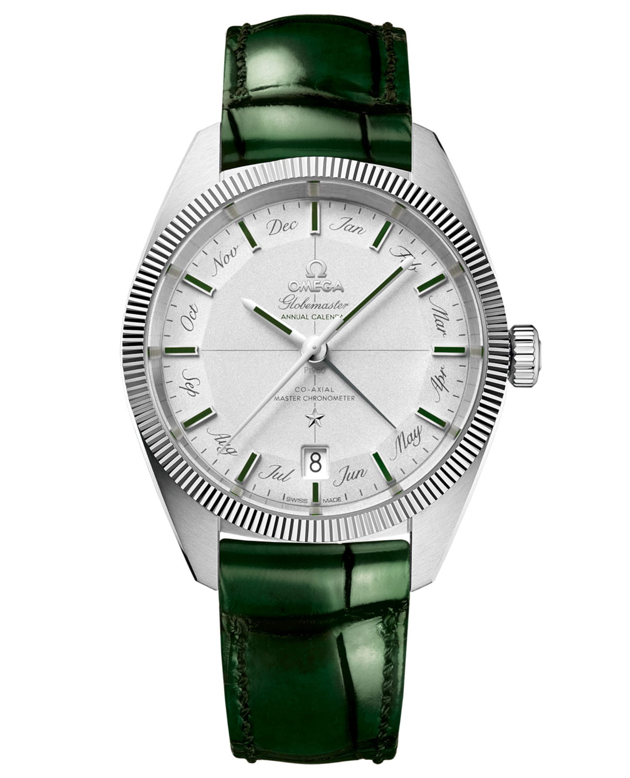 В центре циферблата напечатана крестообразная мушка, отсылающая к давней традиции хронометрическихХронографФункция позволяет измерять отрезки времени с особой точностью: часы, минуты, секунды. Верным признаком хронографа является наличие на циферблате 3 дополнительных окошек-счётчиков. моделей OMEGA. Часы оснащены зеленым кожаным ремешком и приводятся в движение калибром OMEGA Co-Axial Master Chronometer 8923 с революционной антимагнитной технологией.