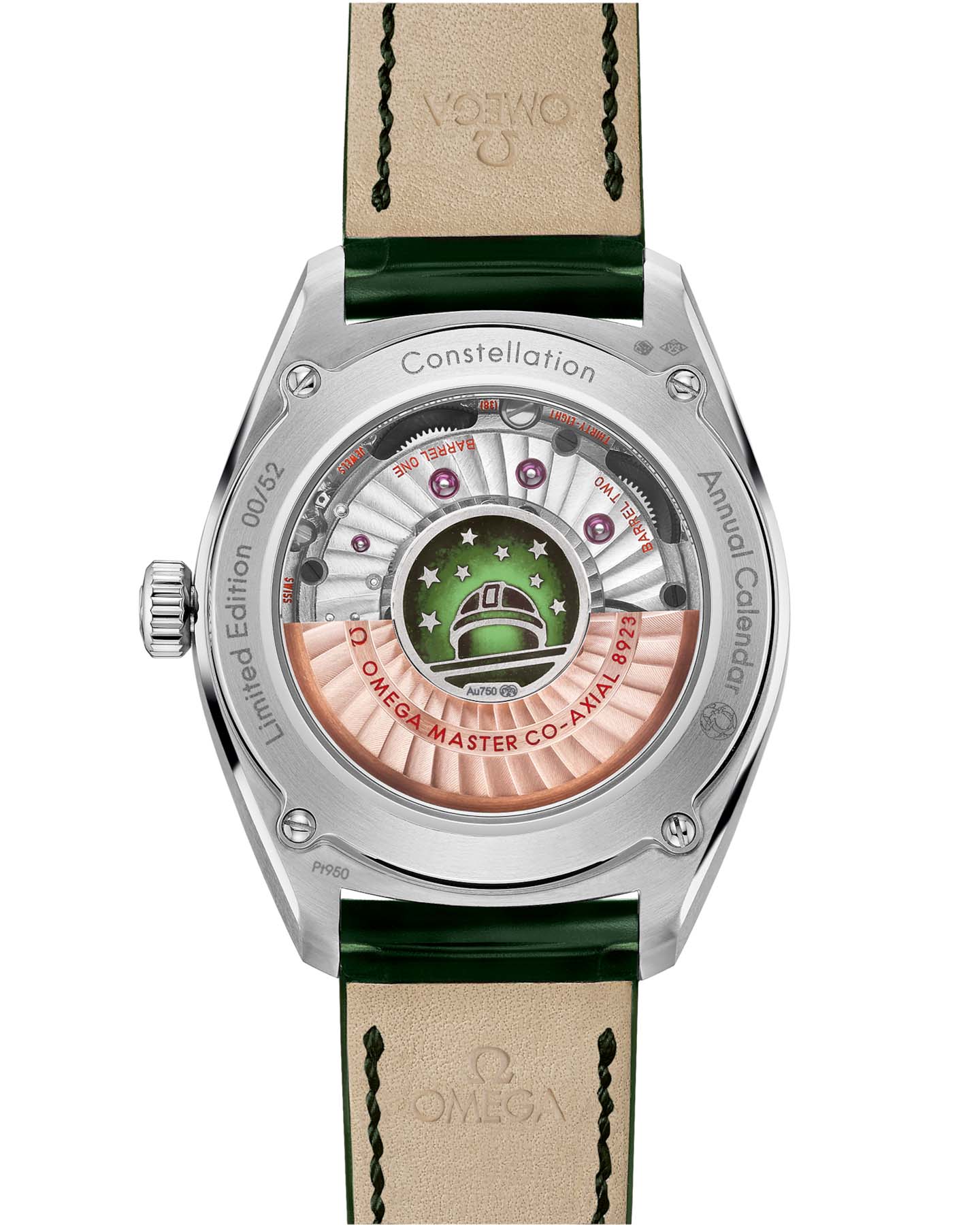 Globemaster уже стало легендарным именем в семействе OMEGA. Теперь он был усовершенствован и стал первым в мире Master Chronometer, что еще больше укрепило его репутацию в часовой индустрии. Эта модель диаметром 41 мм выпущена ограниченной серией всего в 52 экземпляра. Корпус из платины 950 пробы украшен полированным рифленым безелемБезельВнешний ободок, закрепляющий стекло. В спортивных часах так называется поворотное кольцо с делениями на циферблате, выполняет роль таймера – замеряет отрезки времени на шкале. Неподвижный безель – элемент декора. Однонаправленно вращающийся безель на дайверских часах позволяет фиксировать моменты погружения и выныривания на поверхность., а задняя крышка содержит медальон Центральной обсерватории из 18-каратного белого золота18-каратное золотоОбозначение по каратной системе пробирования, оно показывает, сколько драгоценного металла содержится в изделии. 18 карат - в составе 75% чистого золота, соответствует 750 пробе.