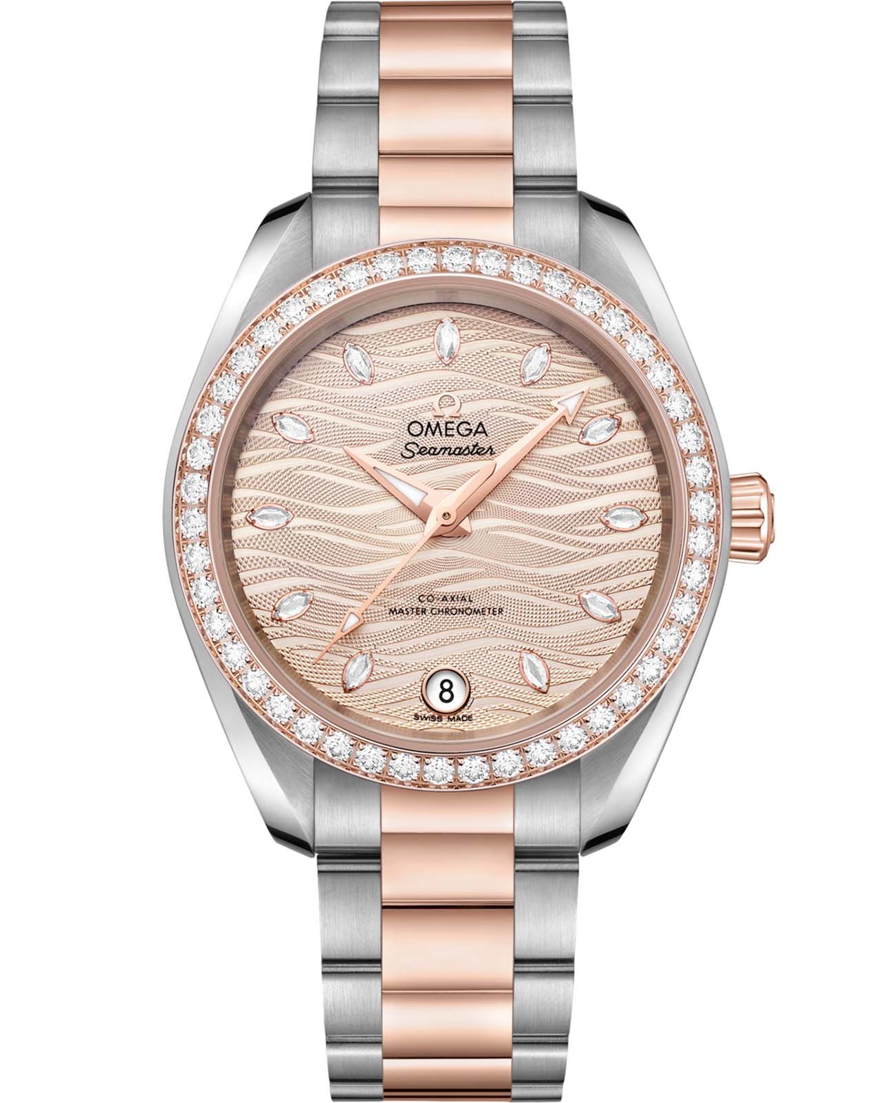 Часы Omega Seamaster Aqua Terra выполнены в симметричном корпусе из нержавеющей стали и 18K Sedna™ золота с завинчивающейся задней крышкой, украшенной волновым узором. Циферблат золотистого цвета дополнен окошком даты на 6 часах и 11 индексами в виде маркиз, установленными по центру. Часовые стрелки и секундная стрелка выполнены из 18K Sedna™ золота с алмазной полировкой для высокой контрастности. Калибр Omega 8800 сертифицирован как Master Chronometer — гарантия высочайшей точности и устойчивости к магнитным полям. Запас хода составляет 55 часов. Защиту циферблата обеспечивает сапфировое стеклоСапфировое стеклоПрочный и надёжный материал из кристалла сапфира синтетического происхождения, характеризующийся особой твёрдостью и устойчивостью к царапинам и повреждениям. с антибликовым покрытиемАнтибликовое покрытиеСлой оксида металла в 0,13-0,3 микрон, благодаря которому стекло часов не бликует и не отражает свет. Антибликовое покрытие уменьшает отражение света в 10 раз, обеспечивая отличную читаемость показателей циферблата. с обеих сторон. Водозащита позволяет использовать часы в воде без риска повреждения. Часы установлены на браслет из нержавеющей стали и 18K Sedna™ золота с застёжкой-бабочкой с кнопкамиЗастёжка "бабочка"Такой вид застёжки дополняется предохранителями, помогающими избежать случайного раскрытия браслета. Обладают изящным исполнением. . Вес модели — около 108 грамм. Это сочетание премиального качества, технологичности и классического дизайна.