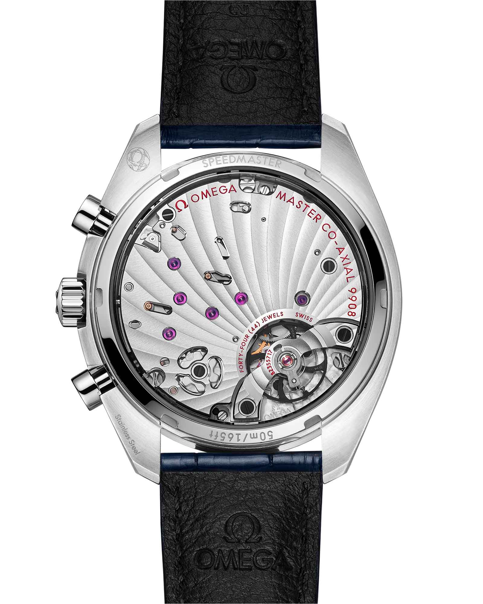 Chronoscope возрождает дух винтажных хронографов 1940-х, переосмысливая их через призму культового стиля Speedmaster. 43-мм корпус из нержавеющей стали с синим безелемБезельВнешний ободок, закрепляющий стекло. В спортивных часах так называется поворотное кольцо с делениями на циферблате, выполняет роль таймера – замеряет отрезки времени на шкале. Неподвижный безель – элемент декора. Однонаправленно вращающийся безель на дайверских часах позволяет фиксировать моменты погружения и выныривания на поверхность. из анодированного алюминия обрамляет серебристый циферблат, украшенный спиралевидным узором. Синие стрелки в форме листьев и арабские цифры создают элегантный контраст, а три исторические шкалы в форме улитки - тахиметрическая, пульсометрическая и телеметрическая - добавляют функциональности. Часы дополнены синим кожаным ремешком, подчеркивая их винтажный характер, а калибр OMEGA Co-Axial Master Chronometer 9908 обеспечивает безупречную точность, соединяя традиции с современными технологиями. На позиции "9 часов" расположен секундный счетчик, в то время как на "3 часах" удобно разместились 60-минутный и 12-часовой индикаторы.