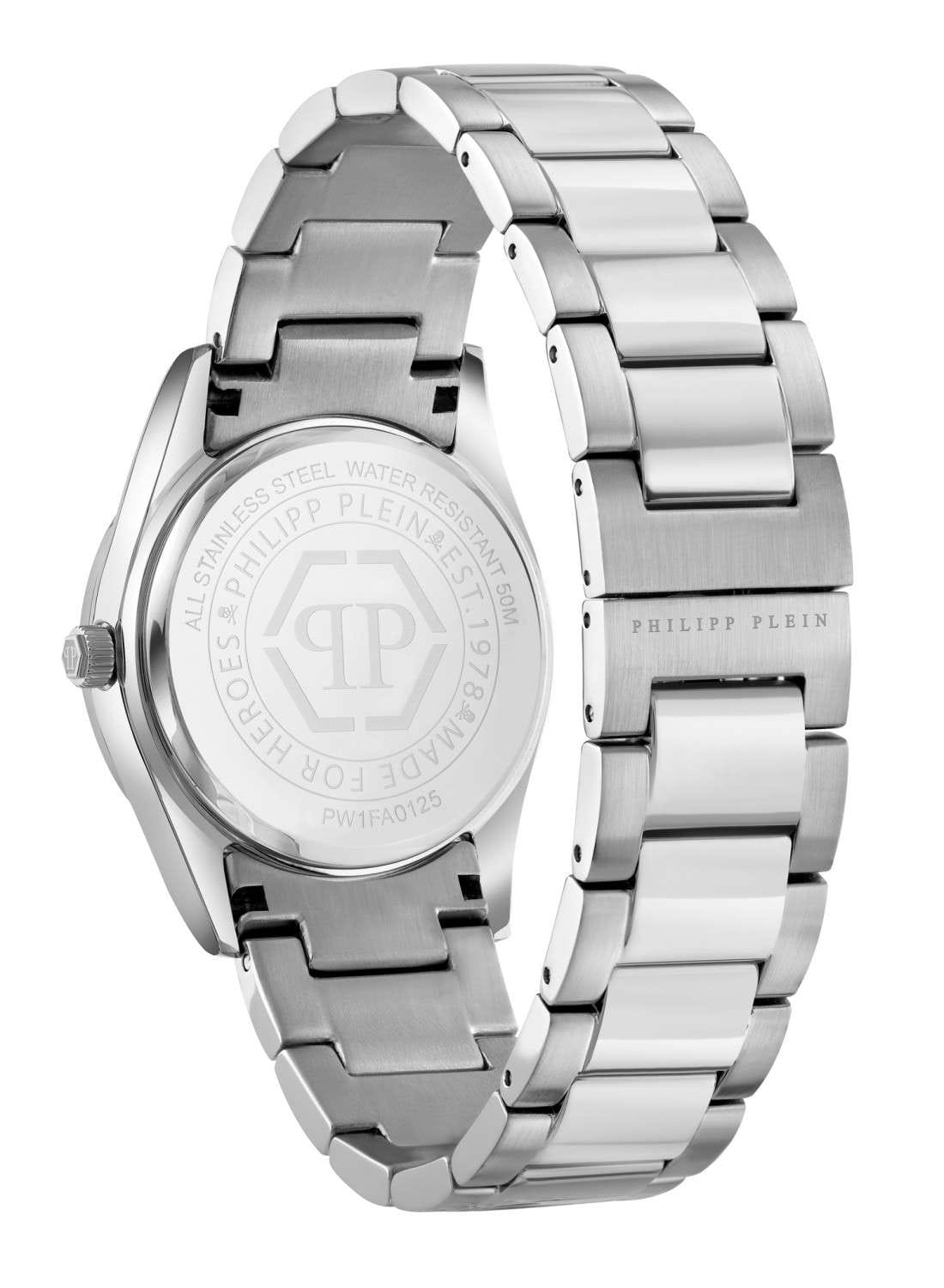 Женские кварцевые часы Philipp Plein Plein Icon Chain PW1FA0125 — это стильное сочетание элегантности и современного дизайна. Изящный корпус выполнен из нержавеющей стали, диаметром 36 мм, что придаст образу женственности и романтизма. Изысканный циферблат с метками в виде штрихов придает модели особый блеск. Циферблат защищен минеральным стекломМинеральное стеклоМинеральное стекло представляет собой искусственно выращенный минерал кварца. Такое стекло отличается особой устойчивостью к повреждениям и царапинам. Уступает по некоторым качествам сапфировому стеклу., обеспечивающий устойчивость к царапинам и украшен кристаллами. Стрелки с люминесцентным покрытиемЛюминесцентное покрытиеПозволяет считывать показания времени в темноте. Производители наносят на стрелки, часовые индексы, безель или поверхность циферблата светонакопительный состав, дающий холодное свечение.. Часы оснащены надежным кварцевым механизмом. Стальной браслет на застёжке-бабочкеЗастёжка "бабочка"Такой вид застёжки дополняется предохранителями, помогающими избежать случайного раскрытия браслета. Обладают изящным исполнением. , гарантирует комфортное и безопасное ношение. Класс водозащиты: 50 метров позволит защитить корпус от случайных брызг или капель дождя. Phlipp Plein — отличный выбор для тех, кто ценит яркость и качество.