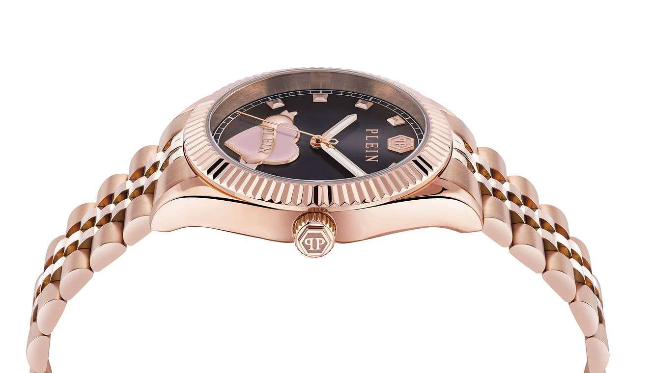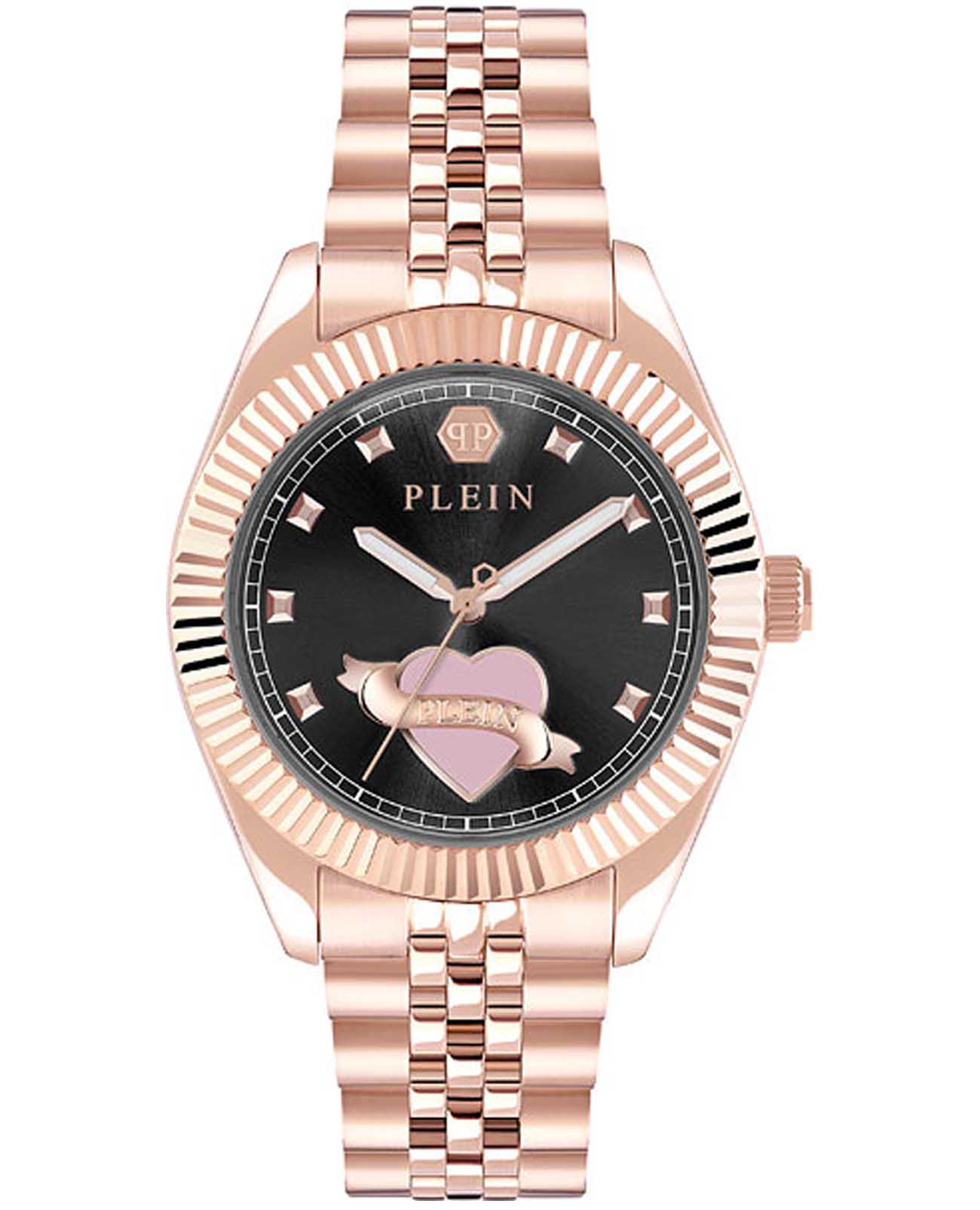 Женские кварцевые часы Philipp Plein Plein Valentine PW2BA1025 – дерзкое заявление любви к роскоши и бунтарскому стилю. Диаметр круглого корпуса из прочной нержавеющей стали с PVD-покрытиемPVDУльтратонкое покрытие наносится в технике вакуумного напыления, сочетает в себе нитрид титана особой прочности со слоем золота или оксида хрома. Несёт в себе декоративную или защитную функцию. равен 38 мм. Минеральное стеклоМинеральное стеклоМинеральное стекло представляет собой искусственно выращенный минерал кварца. Такое стекло отличается особой устойчивостью к повреждениям и царапинам. Уступает по некоторым качествам сапфировому стеклу. защищает циферблат от царапин. Стальной браслет на застёжке «бабочка» с кнопкамиЗастёжка "бабочка"Такой вид застёжки дополняется предохранителями, помогающими избежать случайного раскрытия браслета. Обладают изящным исполнением. обеспечивает надёжную фиксацию и комфортное ношение. Люминесцентное покрытиеЛюминесцентное покрытиеПозволяет считывать показания времени в темноте. Производители наносят на стрелки, часовые индексы, безель или поверхность циферблата светонакопительный состав, дающий холодное свечение. стрелок и меток позволит следить за временем даже в полной темноте. Яркий дизайн с узнаваемым логотипом Plein и смелыми акцентами не оставит вас незамеченным. Идеальный аксессуар для тех, кто ценит индивидуальность и не боится выделяться из толпы.