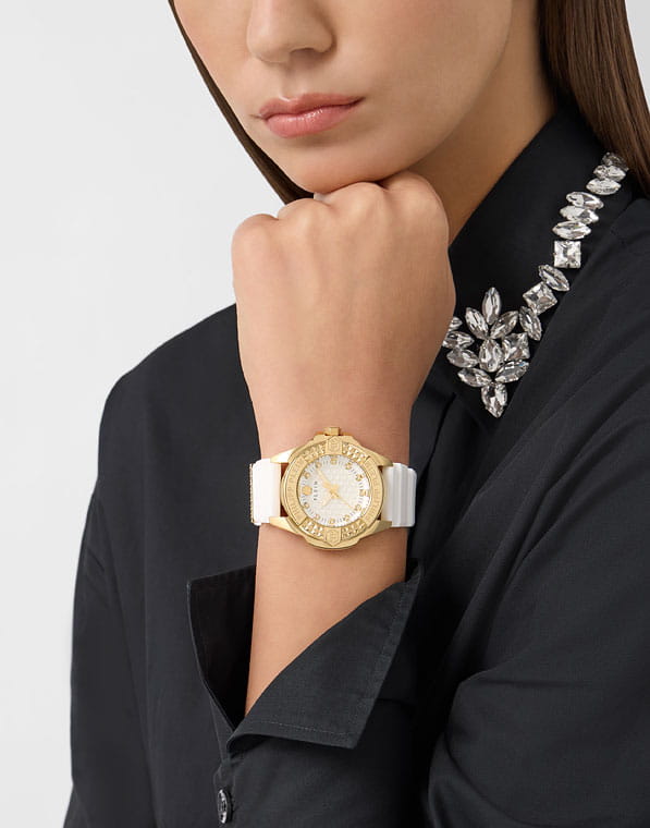 Philipp Plein Plein Majesty PWOFA0125 - дерзкое заявление любви к роскоши и бунтарскому стилю. Диаметр круглого корпуса из прочной нержавеющей стали с PVD-покрытиемPVDУльтратонкое покрытие наносится в технике вакуумного напыления, сочетает в себе нитрид титана особой прочности со слоем золота или оксида хрома. Несёт в себе декоративную или защитную функцию. равен 38 мм. Силиконовый ремешок на стандартной застёжке обеспечивает надёжную фиксацию и комфортное ношение. Метки в виде кристаллов Preciosa. Минеральное стеклоМинеральное стеклоМинеральное стекло представляет собой искусственно выращенный минерал кварца. Такое стекло отличается особой устойчивостью к повреждениям и царапинам. Уступает по некоторым качествам сапфировому стеклу. защищает циферблат от царапин. Люминесцентное покрытиеЛюминесцентное покрытиеПозволяет считывать показания времени в темноте. Производители наносят на стрелки, часовые индексы, безель или поверхность циферблата светонакопительный состав, дающий холодное свечение. стрелок и меток позволит следить за временем даже в полной темноте. Влагозащита: 50 метров, позволит защитить корпус от случайных брызг или капель дождя. Идеальный аксессуар для тех, кто ценит индивидуальность и не боится выделяться из толпы.