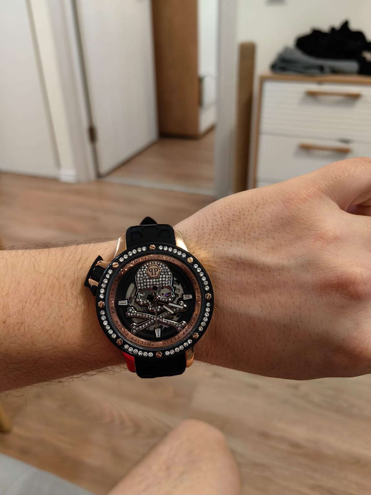 Яркие мужские часы с минеральным стекломМинеральное стеклоМинеральное стекло представляет собой искусственно выращенный минерал кварца. Такое стекло отличается особой устойчивостью к повреждениям и царапинам. Уступает по некоторым качествам сапфировому стеклу. Philipp Plein PWUAA0223, механический механизм с автоподзаводом. Класс водозащиты: 50 метров, позволит защитить корпус от случайных брызг или капель дождя. Корпус часов изготовлен из стали с IP-покрытиемIP-покрытиеМетод ионного напыления. Демонстрирует повышенную устойчивость к истиранию, окислению и химическим веществам. Под воздействием высокого давления и температуры около 1500°C молекулы металла надёжно соединяются с частицами корпуса часов. и украшен кристаллами. Стрелки и метки с люминесцентным покрытиемЛюминесцентное покрытиеПозволяет считывать показания времени в темноте. Производители наносят на стрелки, часовые индексы, безель или поверхность циферблата светонакопительный состав, дающий холодное свечение..