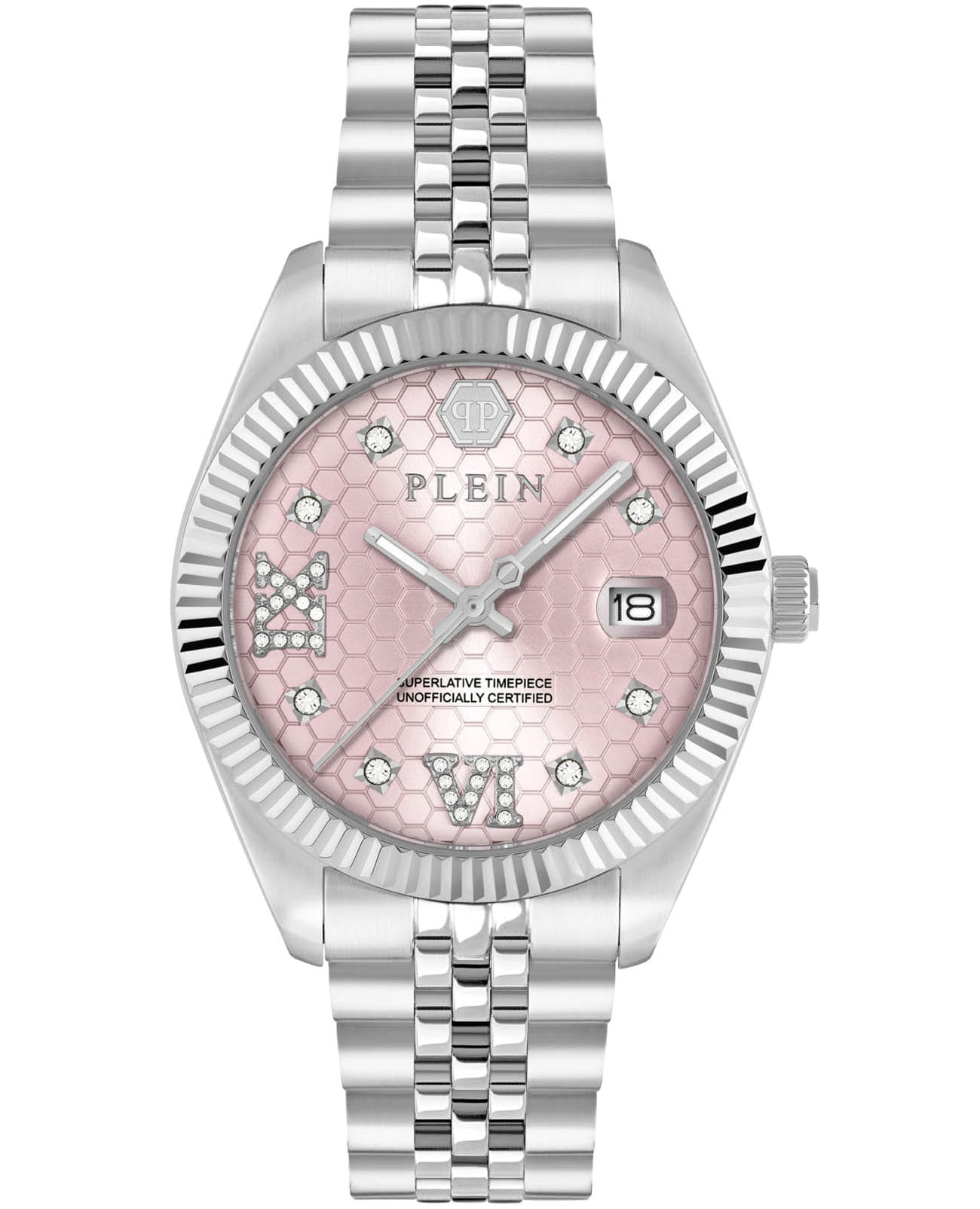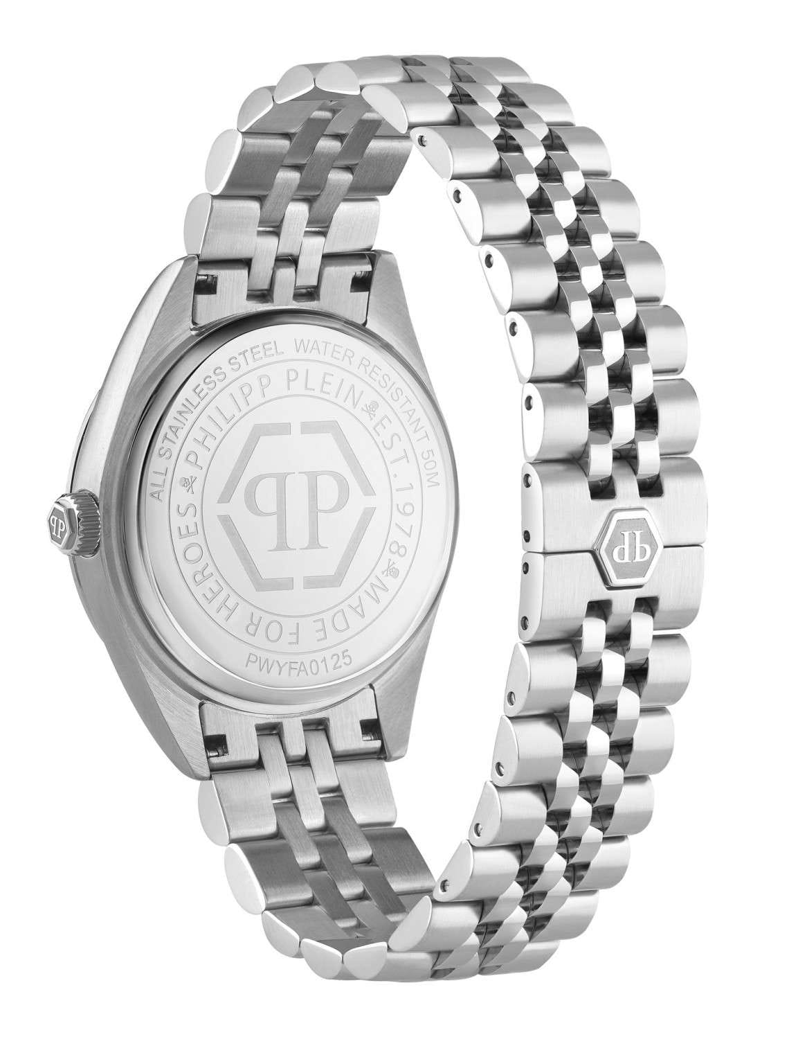 Женские кварцевые часы Philipp Plein Date Superlative PWYFA0125 — это стильное сочетание элегантности и современного дизайна. Изящный корпус выполнен из нержавеющей стали, диаметром 34 мм, что придаст образу женственности и романтизма. Изысканный циферблат с метками в виде точек придает модели особый блеск. Циферблат защищен минеральным стекломМинеральное стеклоМинеральное стекло представляет собой искусственно выращенный минерал кварца. Такое стекло отличается особой устойчивостью к повреждениям и царапинам. Уступает по некоторым качествам сапфировому стеклу., обеспечивающий устойчивость к царапинам и украшен кристаллами. Стрелки с люминесцентным покрытиемЛюминесцентное покрытиеПозволяет считывать показания времени в темноте. Производители наносят на стрелки, часовые индексы, безель или поверхность циферблата светонакопительный состав, дающий холодное свечение.. Часы оснащены надежным кварцевым механизмом. Окошко даты находится в положении 3 часа. Стальной браслет на застёжке-бабочкеЗастёжка "бабочка"Такой вид застёжки дополняется предохранителями, помогающими избежать случайного раскрытия браслета. Обладают изящным исполнением. , гарантирует комфортное и безопасное ношение. Класс водозащиты: 50 метров позволит защитить корпус от случайных брызг или капель дождя. Phlipp Plein — отличный выбор для тех, кто ценит яркость и качество.