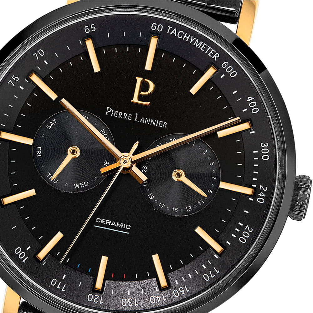 Мужские кварцевые часы Pierre Lannier Ceramic 245G039. Центральные часовая, минутная и секундная стрелки. Черный циферблат с часовыми индексами в виде штрихов. Окошко даты в позиции 6 часов. Круглый корпус выполнен нержавеющей стали с IP-покрытиемIP-покрытиеМетод ионного напыления. Демонстрирует повышенную устойчивость к истиранию, окислению и химическим веществам. Под воздействием высокого давления и температуры около 1500°C молекулы металла надёжно соединяются с частицами корпуса часов.. Стальной браслет с IP-покрытиемIP-покрытиеМетод ионного напыления. Демонстрирует повышенную устойчивость к истиранию, окислению и химическим веществам. Под воздействием высокого давления и температуры около 1500°C молекулы металла надёжно соединяются с частицами корпуса часов. на застёжке-бабочке с кнопкамиЗастёжка "бабочка"Такой вид застёжки дополняется предохранителями, помогающими избежать случайного раскрытия браслета. Обладают изящным исполнением. . Прочное минеральное стеклоМинеральное стеклоМинеральное стекло представляет собой искусственно выращенный минерал кварца. Такое стекло отличается особой устойчивостью к повреждениям и царапинам. Уступает по некоторым качествам сапфировому стеклу., устойчивое к мелким механическим повреждениям. Водостойкость: 50 метров, позволит защитить корпус от случайных брызг или капель дождя.