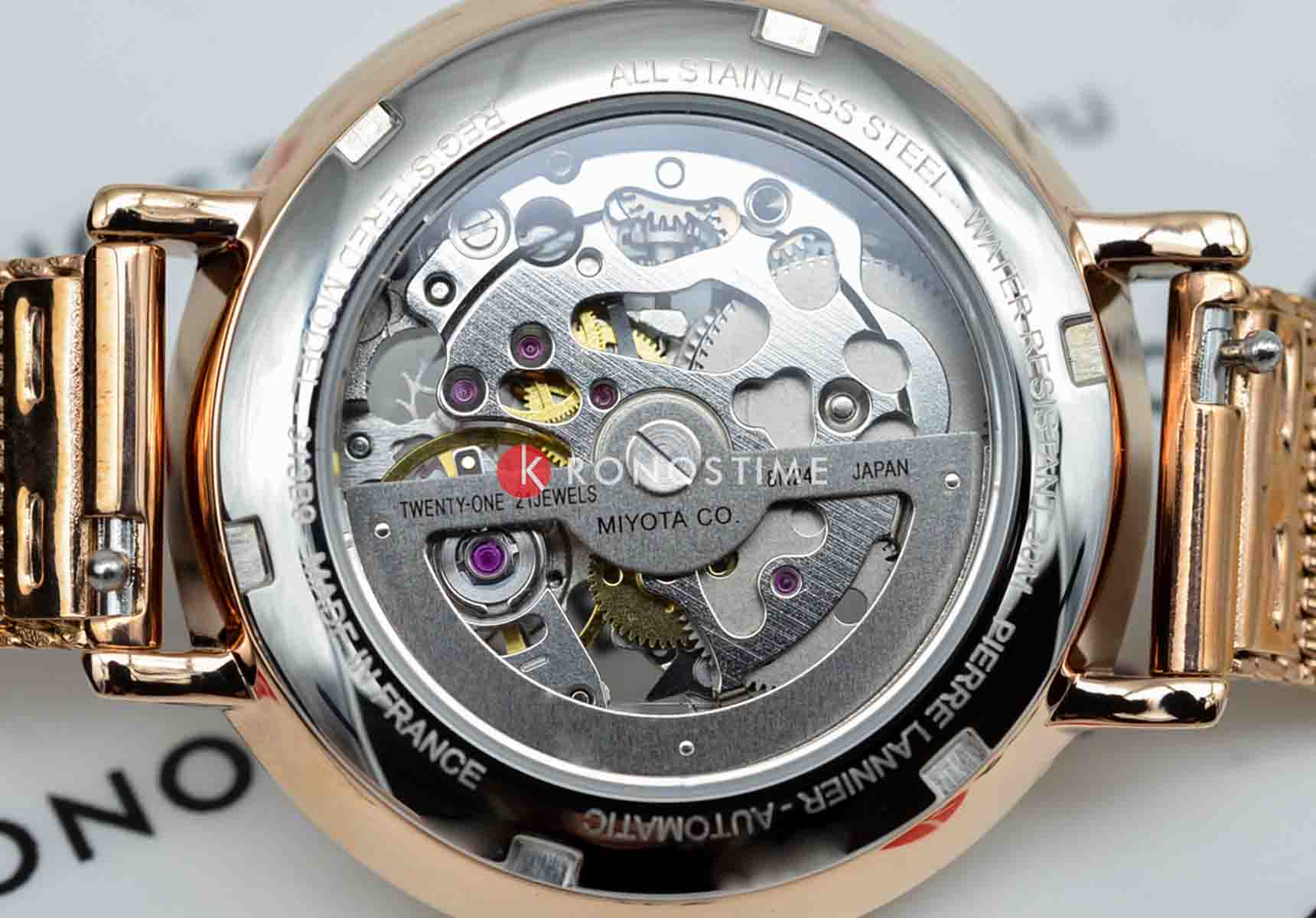 Женские механические часы с автоподзаводом Pierre Lannier Automatic 313B938. Минеральное стеклоМинеральное стеклоМинеральное стекло представляет собой искусственно выращенный минерал кварца. Такое стекло отличается особой устойчивостью к повреждениям и царапинам. Уступает по некоторым качествам сапфировому стеклу. устойчивое к мелким механическим повреждениям. Скелетонизированный циферблат с золотистыми стрелками и часовыми метками. Центральные часовая, минутная и секундная стрелки. Круглый корпус выполнен из полированной нержавеющей стали с PVD-покрытиемPVDУльтратонкое покрытие наносится в технике вакуумного напыления, сочетает в себе нитрид титана особой прочности со слоем золота или оксида хрома. Несёт в себе декоративную или защитную функцию. цвета розового золота. Диаметр корпуса составляет 35 мм, толщина 12 мм. Стальной браслет с покрытием выполнен шириной 14 мм в технике миланского плетения, раскладная застёжкаРаскладная застёжкаТакой тип застёжки используется только на браслетах из металла. Она никогда не раскрывается полностью, происходит разделение на 2 и более частей. Раскладывающая застёжка снизит вероятность потери часов к минимуму.. Неподвижный безельБезельВнешний ободок, закрепляющий стекло. В спортивных часах так называется поворотное кольцо с делениями на циферблате, выполняет роль таймера – замеряет отрезки времени на шкале. Неподвижный безель – элемент декора. Однонаправленно вращающийся безель на дайверских часах позволяет фиксировать моменты погружения и выныривания на поверхность. из нержавеющей стали с PVD-покрытиемPVDУльтратонкое покрытие наносится в технике вакуумного напыления, сочетает в себе нитрид титана особой прочности со слоем золота или оксида хрома. Несёт в себе декоративную или защитную функцию. цвета розового золота. Водостойкость: 30 метров, позволит защитить корпус от случайных брызг или капель дождя.