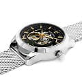 Мужские механические часы с автоподзаводом Pierre Lannier Automatic 374F131. Минеральное стеклоМинеральное стеклоМинеральное стекло представляет собой искусственно выращенный минерал кварца. Такое стекло отличается особой устойчивостью к повреждениям и царапинам. Уступает по некоторым качествам сапфировому стеклу. устойчивое к мелким механическим повреждениям. Центральные часовая, минутная и секундная стрелки. Корпус выполнен из нержавеющей стали. Водостойкость: 50 метров, позволит защитить корпус от случайных брызг или капель дождя. Стальной браслет миланского плетения с раскладной застёжкойРаскладная застёжкаТакой тип застёжки используется только на браслетах из металла. Она никогда не раскрывается полностью, происходит разделение на 2 и более частей. Раскладывающая застёжка снизит вероятность потери часов к минимуму.. Стрелки с люминесцентным покрытиемЛюминесцентное покрытиеПозволяет считывать показания времени в темноте. Производители наносят на стрелки, часовые индексы, безель или поверхность циферблата светонакопительный состав, дающий холодное свечение.. Черный скелетонизированный циферблат. В комплекте черный кожаный ремешок.