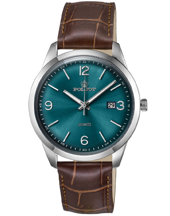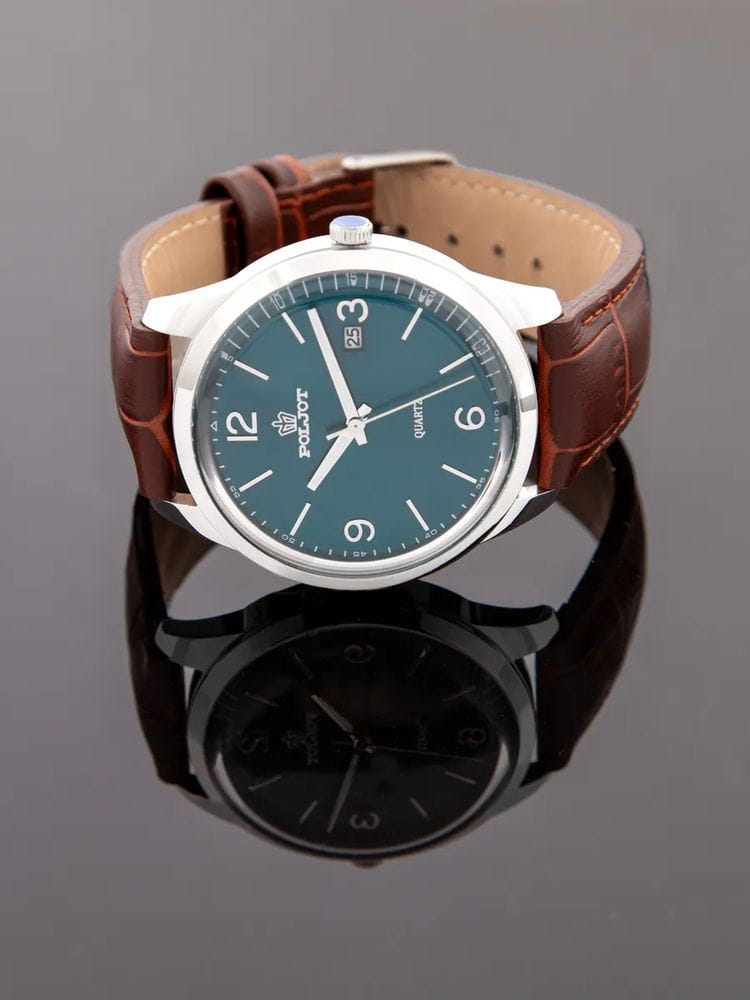 Poljot 2315.581210 — элегантные кварцевые мужские часы, объединяющие лаконичный дизайн и повседневную универсальность. Корпус из нержавеющей стали подчёркивает строгость линий и сдержанную эстетику, а глубокий циферблат с аккуратным гильоше и арабскими цифрами создаёт гармоничное визуальное равновесие. Тонкие серебристые стрелки с люминесцентным покрытиемЛюминесцентное покрытиеПозволяет считывать показания времени в темноте. Производители наносят на стрелки, часовые индексы, безель или поверхность циферблата светонакопительный состав, дающий холодное свечение. обеспечивают лёгкость восприятия времени, а окно даты на позиции «3 часа» добавляет практичности. Прочное минеральное стеклоМинеральное стеклоМинеральное стекло представляет собой искусственно выращенный минерал кварца. Такое стекло отличается особой устойчивостью к повреждениям и царапинам. Уступает по некоторым качествам сапфировому стеклу. защищает циферблат от мелких повреждений, а ремешок из натуральной кожи с фактурой крокодила обеспечивает комфорт и элегантное прилегание к запястью. Poljot — это часы для мужчин, ценящих точность, простоту и утончённый повседневный стиль.