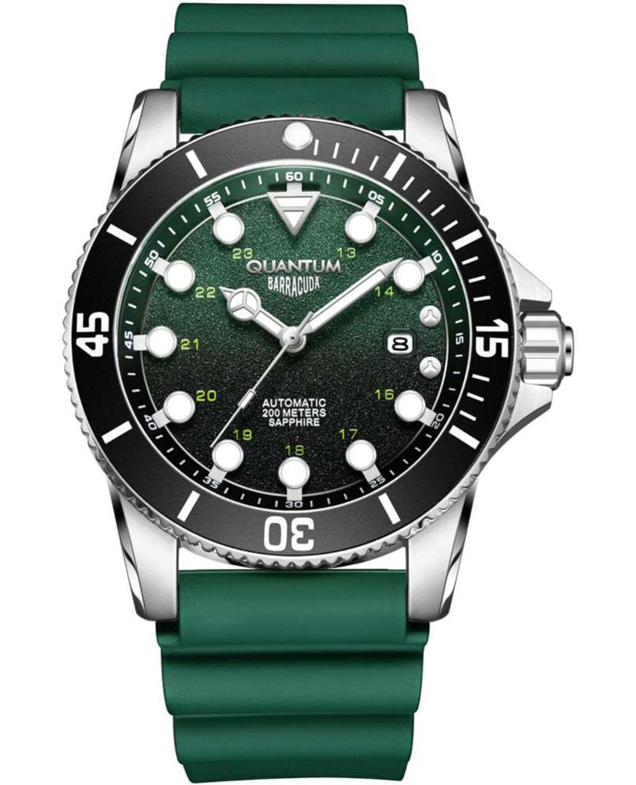 Мужские механические часы с автоподзаводом Quantum BAR1115.375 — надёжный спортивный аксессуар с ярким дизайном и усиленной водозащитой. Корпус круглый, из нержавеющей стали, диаметром 44 мм. Циферблат — зелёный с окошком даты. Стекло — сапфировоеСапфировое стеклоПрочный и надёжный материал из кристалла сапфира синтетического происхождения, характеризующийся особой твёрдостью и устойчивостью к царапинам и повреждениям.. Механизм — японский автоматический Citizen с функцией автоподзавода. Водонепроницаемость 200 м. Ремешок — зелёный силиконовый «гармошка» на стандартной застёжке. Идеальный выбор для тех, кто ценит турецкий дизайн и высокую функциональность.