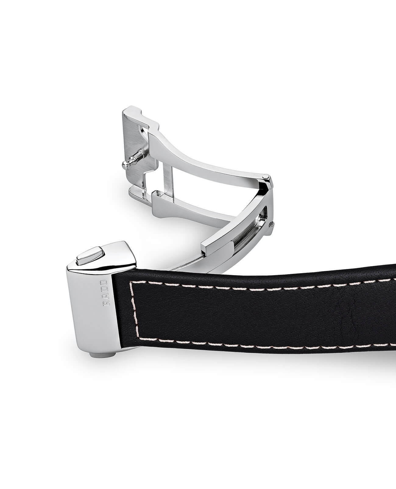Премиальный хронографХронографФункция позволяет измерять отрезки времени с особой точностью: часы, минуты, секунды. Верным признаком хронографа является наличие на циферблате 3 дополнительных окошек-счётчиков. на классическом ремешке из натуральной кожи позволит поддерживать правильный имидж. Это лучший вариант для солидного бизнесмена или руководителя компании. Наручные часы с автоподзаводом оснащены швейцарским калибром ETA A05.H21, запас хода сохраняется до 54 часов. Прозрачная задняя крышка корпуса позволяет наблюдать за движением деталей механизма. Корпус из нержавеющей стали 316L. БезельБезельВнешний ободок, закрепляющий стекло. В спортивных часах так называется поворотное кольцо с делениями на циферблате, выполняет роль таймера – замеряет отрезки времени на шкале. Неподвижный безель – элемент декора. Однонаправленно вращающийся безель на дайверских часах позволяет фиксировать моменты погружения и выныривания на поверхность. из высокотехнологичной керамикиВысокотехнологичная керамикаИнновационный запатентованный Rado материал с гладкой или матовой поверхностью. Керамика за счёт кристаллической структуры обладает повышенной устойчивостью от возникновения царапин. Материал способен принимать температуру тела человека, обеспечивая невероятный комфорт при ношении.. Стрелки с люминесцентной подсветкойЛюминесцентное покрытиеПозволяет считывать показания времени в темноте. Производители наносят на стрелки, часовые индексы, безель или поверхность циферблата светонакопительный состав, дающий холодное свечение.. Сапфировое стекло с антибликовой поверхностью. Водостойкость 100 метров. Секундомер, отображение даты. . Диаметр корпуса: 44 мм.