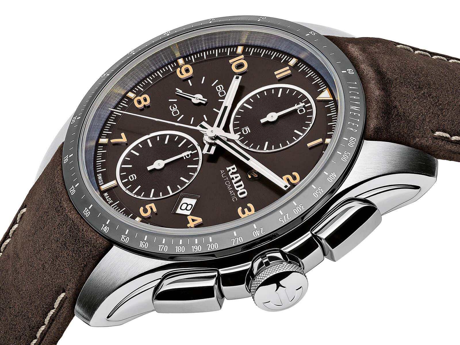 Премиальный хронографХронографФункция позволяет измерять отрезки времени с особой точностью: часы, минуты, секунды. Верным признаком хронографа является наличие на циферблате 3 дополнительных окошек-счётчиков. на классическом коричневом ремешке из натуральной кожи позволит поддерживать правильный имидж. Это лучший вариант для солидного бизнесмена или руководителя компании. Наручные часы с автоподзаводом оснащены швейцарским калибром ETA A05.H21, запас хода сохраняется до 54 часов. Прозрачная задняя крышка корпуса позволяет наблюдать за движением деталей механизма. Корпус из нержавеющей стали 316L. БезельБезельВнешний ободок, закрепляющий стекло. В спортивных часах так называется поворотное кольцо с делениями на циферблате, выполняет роль таймера – замеряет отрезки времени на шкале. Неподвижный безель – элемент декора. Однонаправленно вращающийся безель на дайверских часах позволяет фиксировать моменты погружения и выныривания на поверхность. из высокотехнологичной керамикиВысокотехнологичная керамикаИнновационный запатентованный Rado материал с гладкой или матовой поверхностью. Керамика за счёт кристаллической структуры обладает повышенной устойчивостью от возникновения царапин. Материал способен принимать температуру тела человека, обеспечивая невероятный комфорт при ношении.. Стрелки с люминесцентной подсветкойЛюминесцентное покрытиеПозволяет считывать показания времени в темноте. Производители наносят на стрелки, часовые индексы, безель или поверхность циферблата светонакопительный состав, дающий холодное свечение.. Сапфировое стекло с антибликовой поверхностью. Водостойкость 100 метров. Секундомер, отображение даты. . Диаметр корпуса: 44 мм.