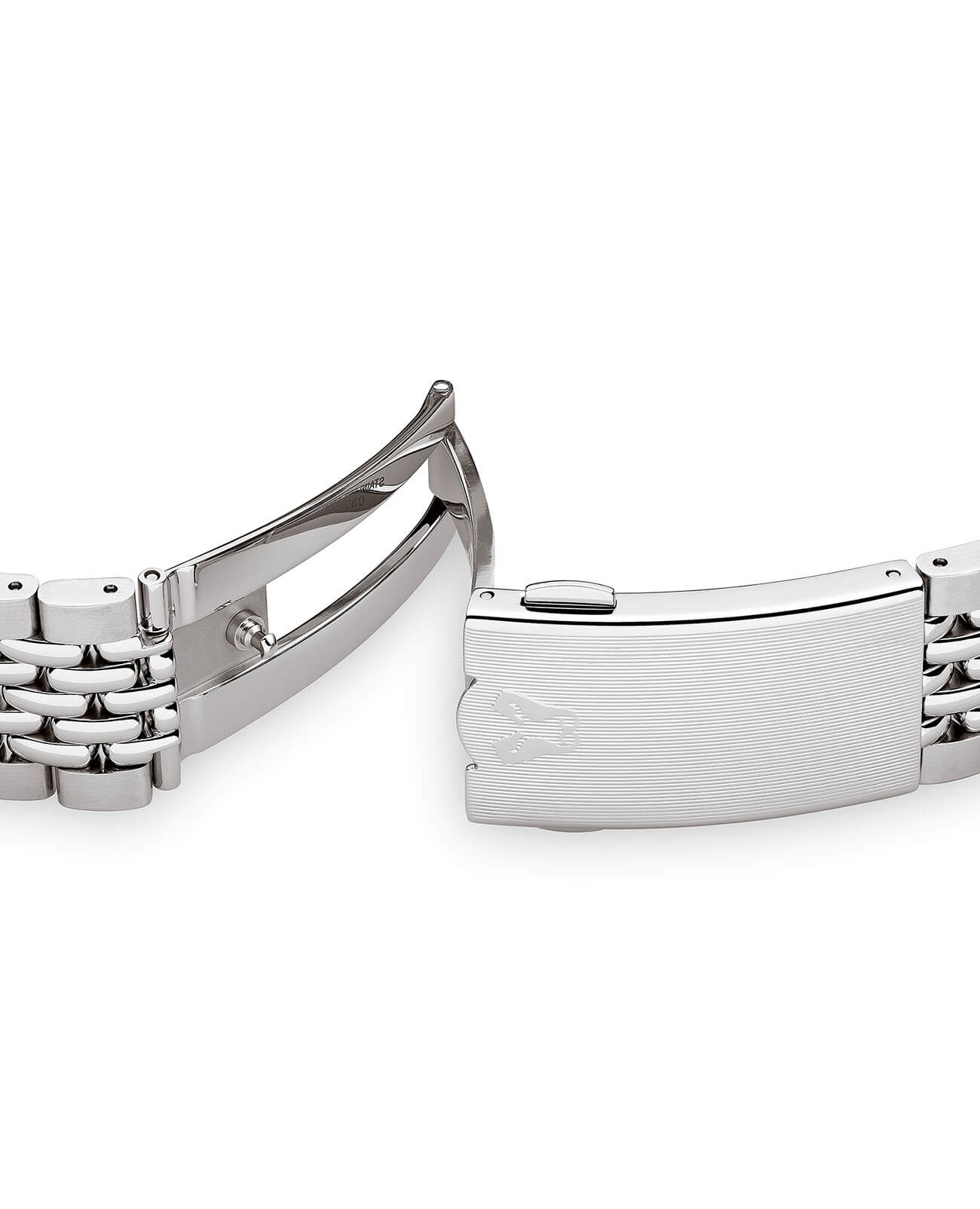 Модель относится к премиальному сегменту, стильно смотрится синий узорчатый циферблат с контрастными элементами. Нижняя часть дополнена эмблемой в виде морских коньков, в верхней находится узнаваемый логотип Rado. Часы сделаны из нержавеющей стали 316L, как и первые аксессуары из линейки Golden Horse, отличием стал безельБезельВнешний ободок, закрепляющий стекло. В спортивных часах так называется поворотное кольцо с делениями на циферблате, выполняет роль таймера – замеряет отрезки времени на шкале. Неподвижный безель – элемент декора. Однонаправленно вращающийся безель на дайверских часах позволяет фиксировать моменты погружения и выныривания на поверхность. из материала CeramosCeramosМатериал являет собой инновационное сочетание высокотехнологичной керамики и сплава металла. Он объединяет керамическую устойчивость к царапинам и металлический роскошный блеск. . Корпус защищает автоматический механизм ETA C07.611 с резервом хода 80 часов от ударов и повреждений. Задняя крышка прозрачная. Стекло из сапфира с обработкой "антиблик". Водостойкость до 5 бар. Отображение текущего числа. Диаметр корпуса: 36,5 мм.