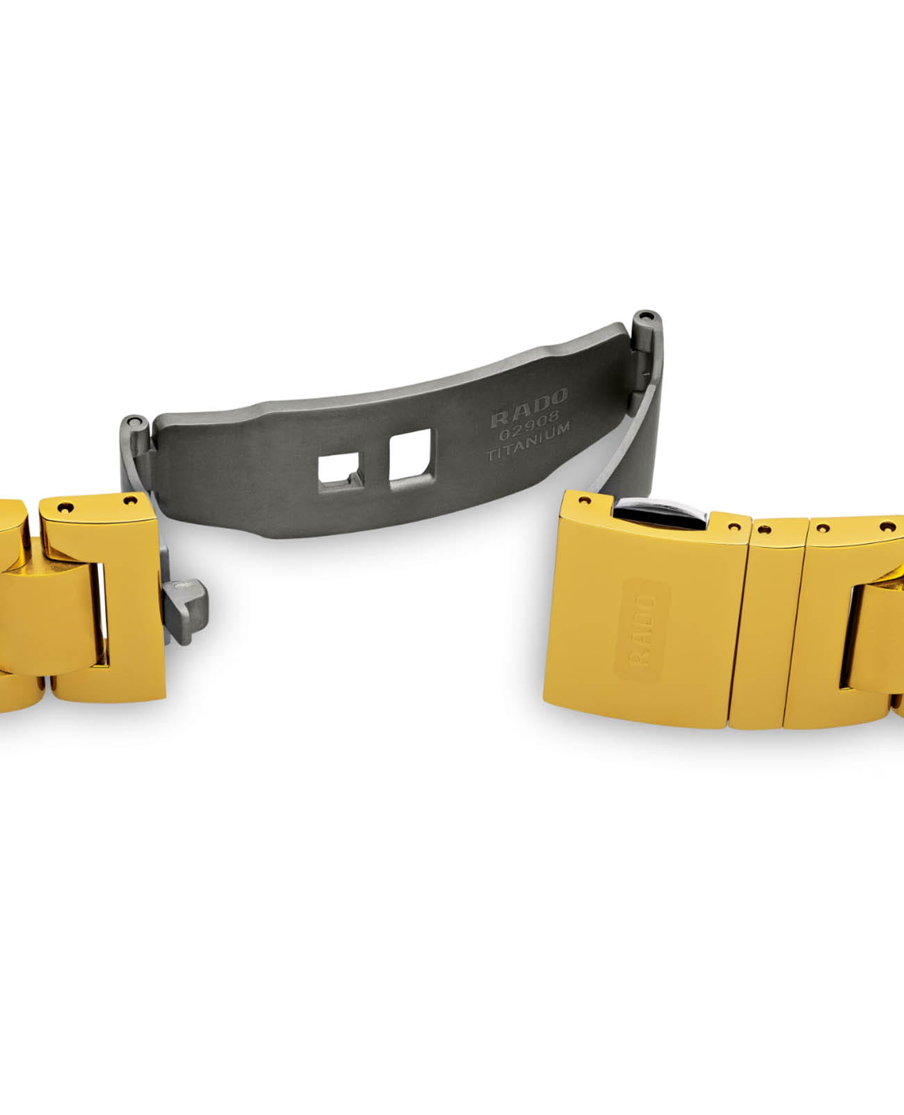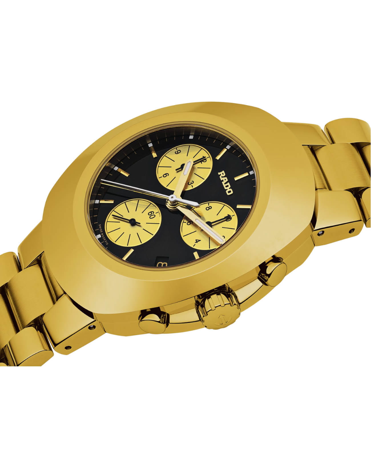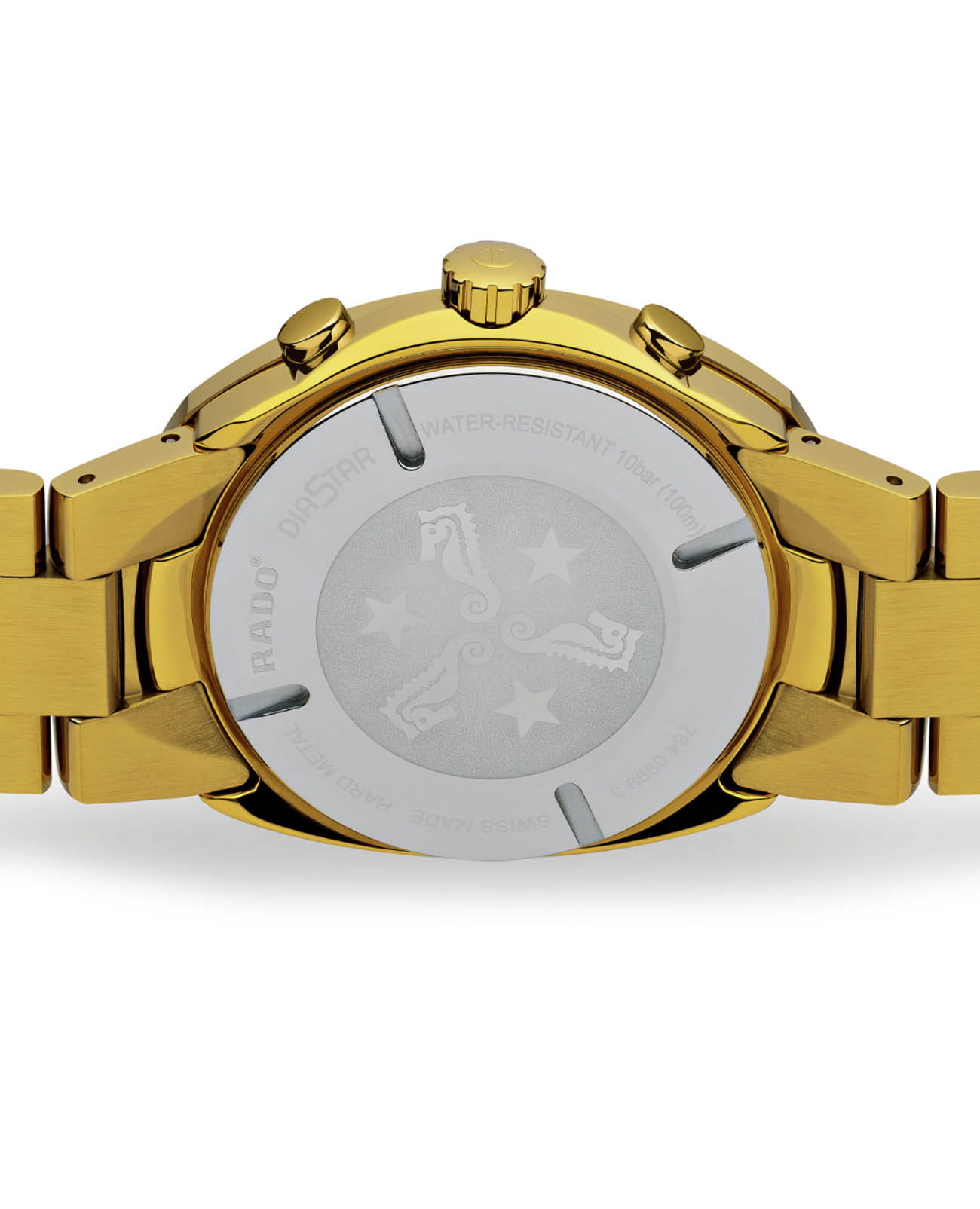 Мужские часы Rado New Original Chronograph R12949153 c хронографомХронографФункция позволяет измерять отрезки времени с особой точностью: часы, минуты, секунды. Верным признаком хронографа является наличие на циферблате 3 дополнительных окошек-счётчиков.. Корпус и браслет часов выполнены из нержавеющей стали с PVD-покрытиемPVDУльтратонкое покрытие наносится в технике вакуумного напыления, сочетает в себе нитрид титана особой прочности со слоем золота или оксида хрома. Несёт в себе декоративную или защитную функцию.. Стальной браслет на застёжке-бабочке с кнопкамиЗастёжка "бабочка"Такой вид застёжки дополняется предохранителями, помогающими избежать случайного раскрытия браслета. Обладают изящным исполнением. . Класс водозащиты: 30 метров, позволит защитить корпус от случайных брызг или капель дождя. Окошко даты находится в положении 4 часа. Стрелки и метки с люминесцентным покрытиемЛюминесцентное покрытиеПозволяет считывать показания времени в темноте. Производители наносят на стрелки, часовые индексы, безель или поверхность циферблата светонакопительный состав, дающий холодное свечение..