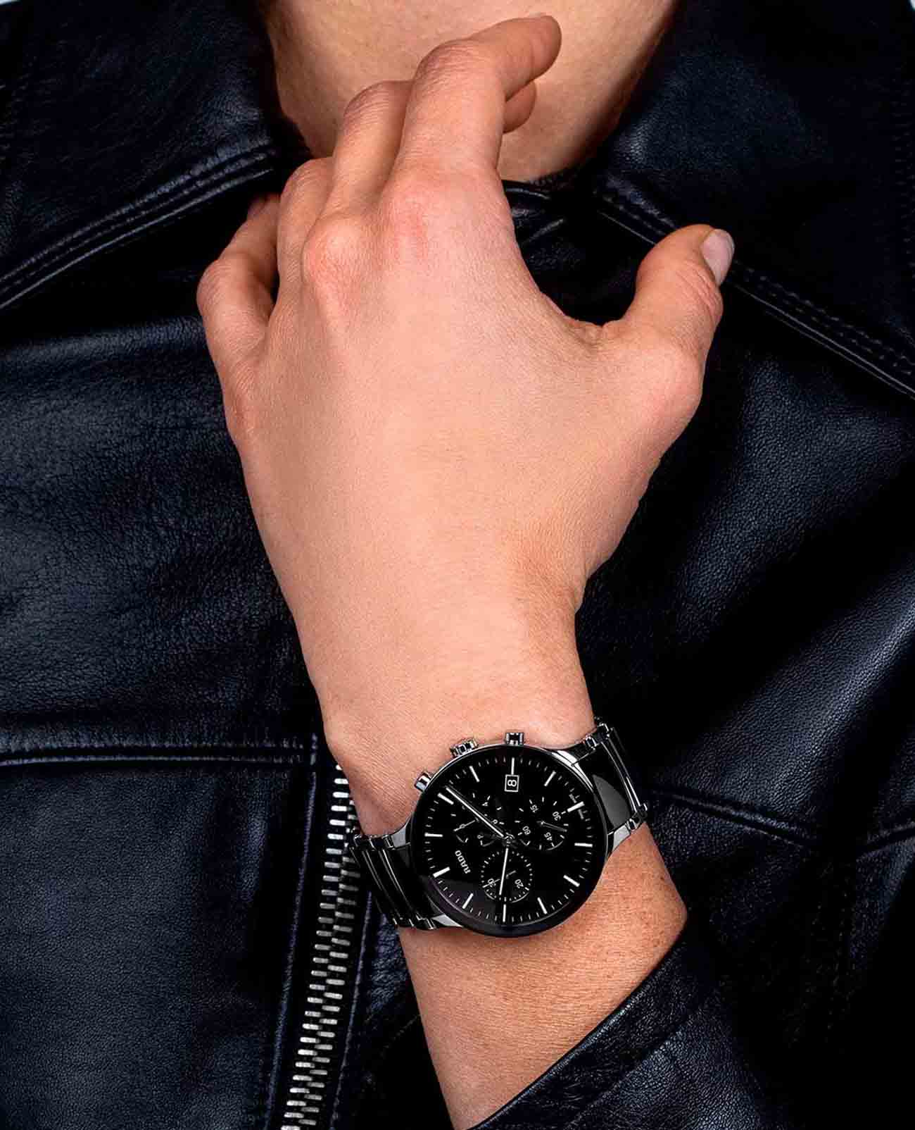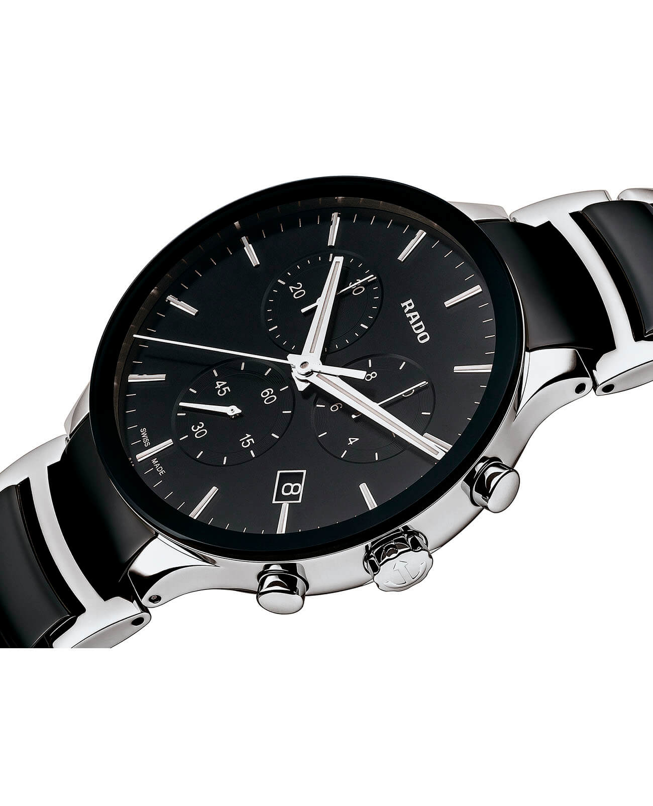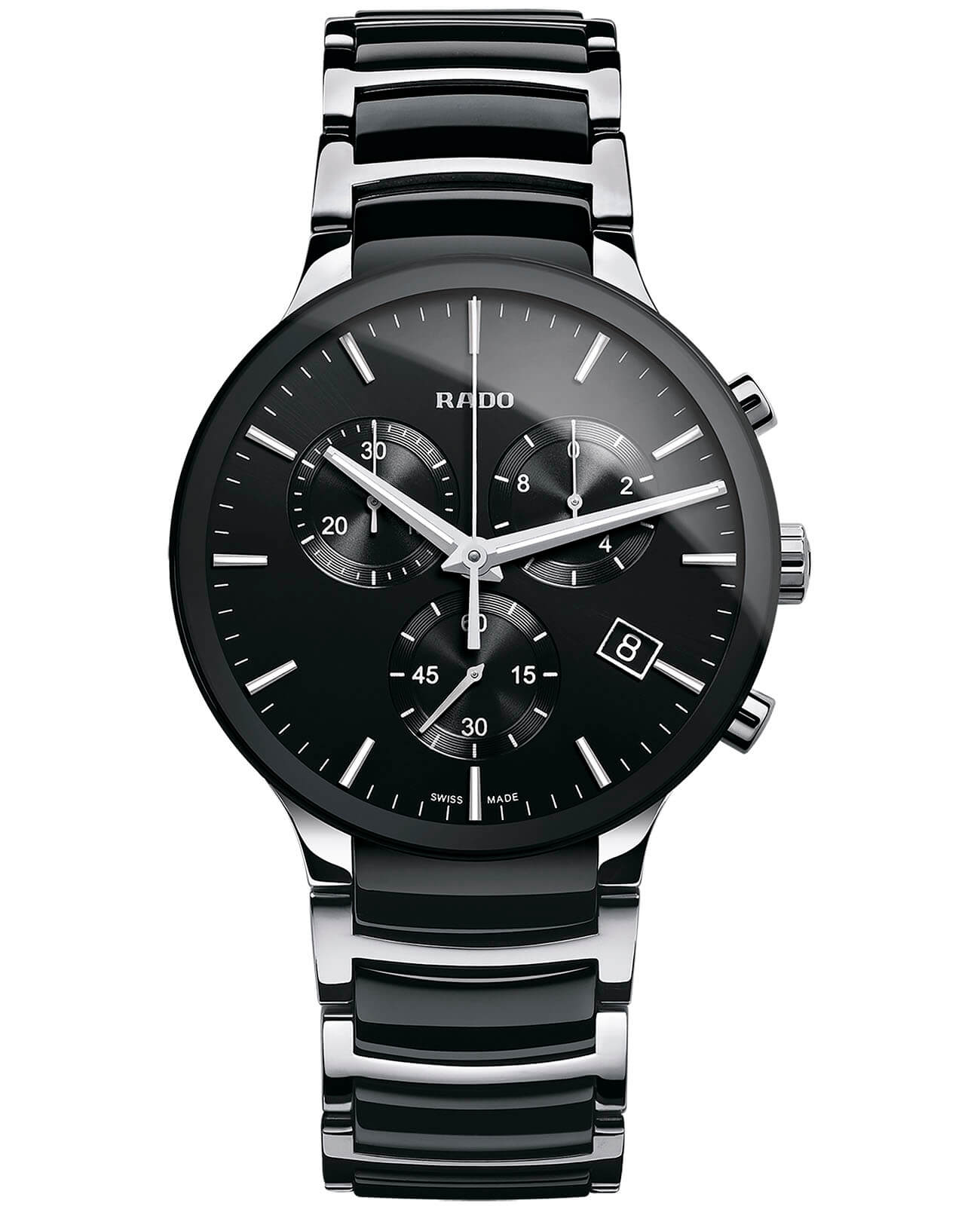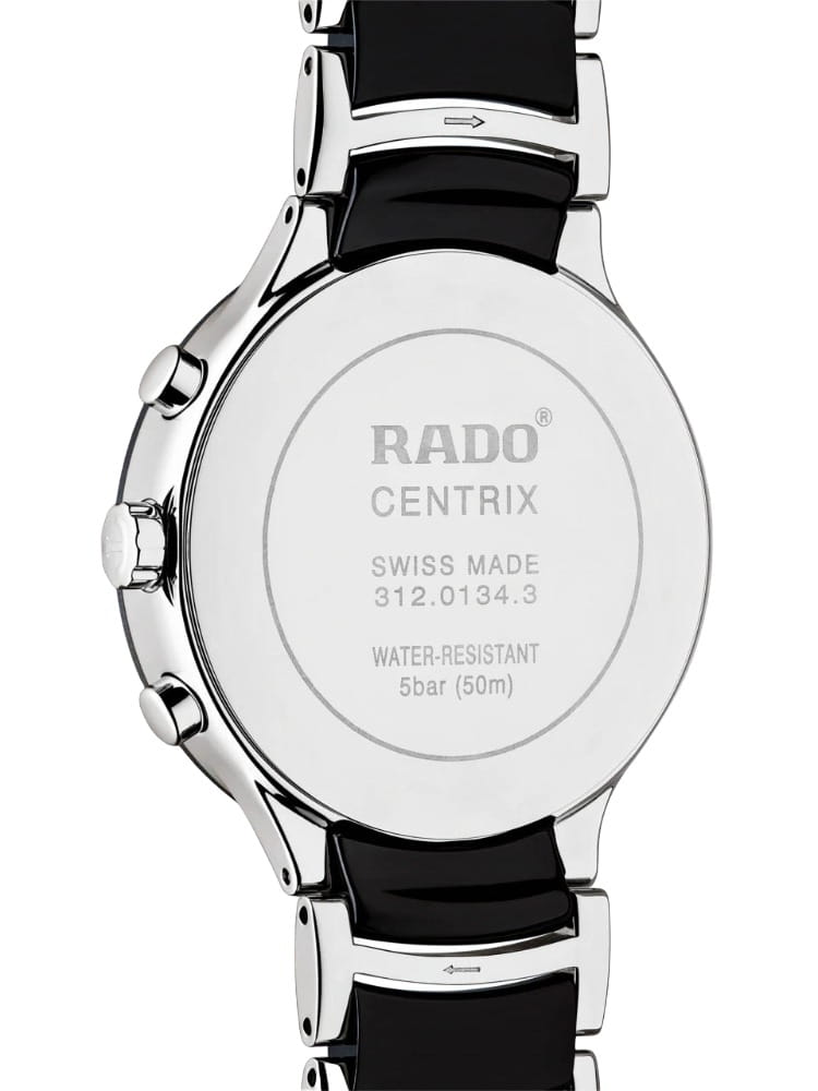 Швейцарские кварцевые часы-хронограф Rado Centrix Chronograph R30130152 — это изысканная комбинация спортивного духа и современного дизайна. Циферблат этих часов защищён сапфировым стекломСапфировое стеклоПрочный и надёжный материал из кристалла сапфира синтетического происхождения, характеризующийся особой твёрдостью и устойчивостью к царапинам и повреждениям., которое славится своей устойчивостью к мелким механическим повреждениям, таким как царапины, что помогает сохранить их первоначальный внешний вид на долгие годы. Корпус часов изготовлен из высококачественной стали и высокотехнологичной керамикиВысокотехнологичная керамикаИнновационный запатентованный Rado материал с гладкой или матовой поверхностью. Керамика за счёт кристаллической структуры обладает повышенной устойчивостью от возникновения царапин. Материал способен принимать температуру тела человека, обеспечивая невероятный комфорт при ношении., что обеспечивает их исключительную прочность и износоустойчивость. Такое сочетание материалов придаёт часам не только изысканную красоту, но и невероятную лёгкость, что делает их комфортными в носке. Окошко даты расположено в положении 4 часов, что позволяет быстро и удобно просматривать текущую дату. Стрелки на циферблате покрыты люминесцентным покрытиемЛюминесцентное покрытиеПозволяет считывать показания времени в темноте. Производители наносят на стрелки, часовые индексы, безель или поверхность циферблата светонакопительный состав, дающий холодное свечение., что обеспечивает хорошую видимость времени даже в условиях низкой освещённости. Класс водозащиты составляет 50 метров, что достаточно для защиты корпуса от случайных брызг воды или попадания капель дождя, делая часы пригодными для повседневного использования. Браслет часов выполнен из стали и высокотехнологичной керамикиВысокотехнологичная керамикаИнновационный запатентованный Rado материал с гладкой или матовой поверхностью. Керамика за счёт кристаллической структуры обладает повышенной устойчивостью от возникновения царапин. Материал способен принимать температуру тела человека, обеспечивая невероятный комфорт при ношении., что придаёт им дополнительную прочность и комфорт при ношении. Застёжка выполнена в виде раскладной застёжкиРаскладная застёжкаТакой тип застёжки используется только на браслетах из металла. Она никогда не раскрывается полностью, происходит разделение на 2 и более частей. Раскладывающая застёжка снизит вероятность потери часов к минимуму., что обеспечивает удобную и надёжную фиксацию на запястье.