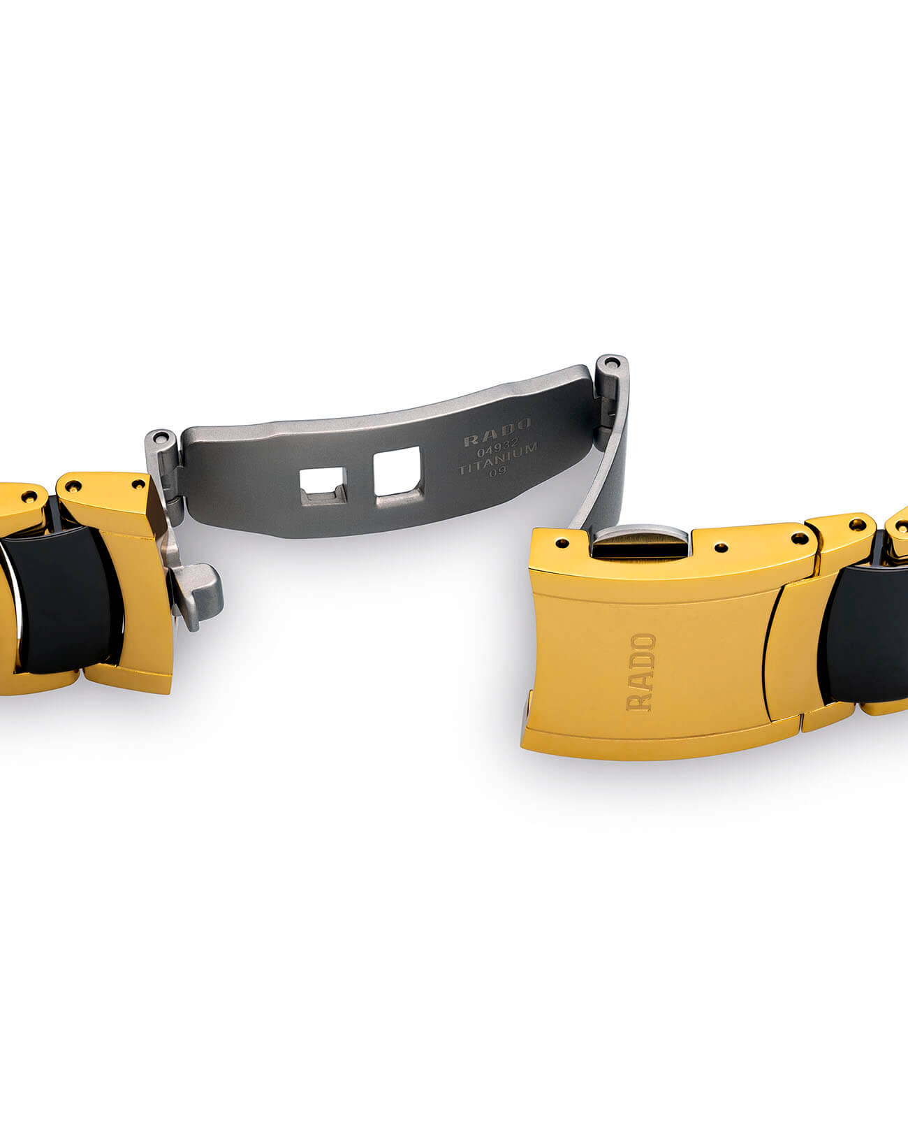 Часы-скелетоны станут главным атрибутом в создании индивидуального образа, оригинальная модель точно станет объектом притяжения окружающих. Внутри корпуса из нержавеющей стали заключён автоматический калибр ETA C07.631 с запасом хода 80 часов. Стальной браслет дополнен вставками из высокотехнологичной керамикиВысокотехнологичная керамикаИнновационный запатентованный Rado материал с гладкой или матовой поверхностью. Керамика за счёт кристаллической структуры обладает повышенной устойчивостью от возникновения царапин. Материал способен принимать температуру тела человека, обеспечивая невероятный комфорт при ношении.. Стекло из сапфира устойчиво к образованию царапин. Водостойкость 3 бар. Золотистое PVD-покрытиеPVDУльтратонкое покрытие наносится в технике вакуумного напыления, сочетает в себе нитрид титана особой прочности со слоем золота или оксида хрома. Несёт в себе декоративную или защитную функцию.. Диаметр корпуса: 38 мм.
