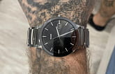 Традиционный круглый циферблат чёрного цвета имеет узор «солнечные лучи», лаконичное исполнение делает аксессуар универсальным вариантом для любого события. Корпус, безель, браслет выполнены из хирургической стали 316L, отличающейся устойчивостью к царапинам и повреждениям. В основе работы находится кварцевый механизм ETA 955.112 с высокой точностью хода. Сапфировое стекло устойчиво к образованию царапин на поверхности. Сохранение водонепроницаемости при давлении до 3 бар. Отображение даты. Диаметр корпуса: 38 мм.