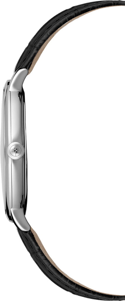 Ремешок изготовлен из черной кожи, гармонично дополняя элегантный внешний вид часов. Для удобства ношения предусмотрена классическая застежка.
