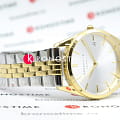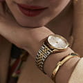 Класс водозащиты 30 метров обеспечивает защиту корпуса от случайных брызг воды или капель дождя, что делает эти часы отличным выбором для активного образа жизни. Стальной браслет с частичным PVD-покрытиемPVDУльтратонкое покрытие наносится в технике вакуумного напыления, сочетает в себе нитрид титана особой прочности со слоем золота или оксида хрома. Несёт в себе декоративную или защитную функцию. и ювелирной застежкой обеспечивает комфортное и безопасное ношение, дополняя общий дизайн часов.