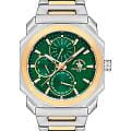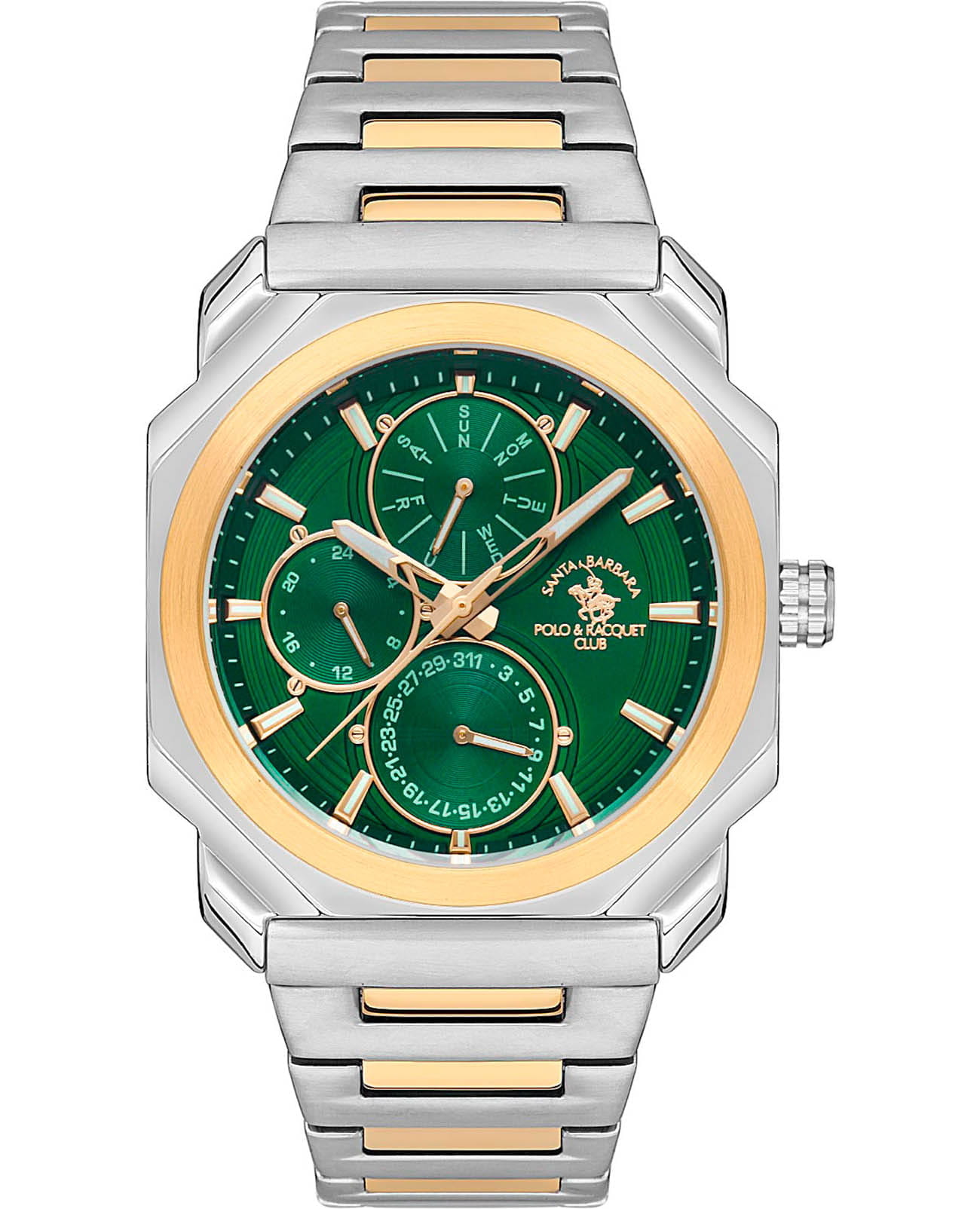 Мужские кварцевые часы Santa Barbara Polo & Racquet Club — это стильный и практичный аксессуар для повседневного ношения. Корпус необычной формы диаметром 42 мм выполнен из стали с матовой и полированной отделкой. Безель из нержавеющей стали с IP-покрытиемIP-покрытиеМетод ионного напыления. Демонстрирует повышенную устойчивость к истиранию, окислению и химическим веществам. Под воздействием высокого давления и температуры около 1500°C молекулы металла надёжно соединяются с частицами корпуса часов.. Циферблат зелёного цвета оформлен в виде концентрических кругов и дополнен фирменным логотипом. Накладные метки в виде штрихов, стрелки прямоугольные, заострённые, в стиле Baton. Указатели дня недели и даты вынесены на отдельные субциферблаты, также присутствует индикация 24-часового формата времени. Стрелки и метки с люминесцентным покрытиемЛюминесцентное покрытиеПозволяет считывать показания времени в темноте. Производители наносят на стрелки, часовые индексы, безель или поверхность циферблата светонакопительный состав, дающий холодное свечение., обеспечивающим хорошую читаемость в темноте. Циферблат защищён минеральным стекломМинеральное стеклоМинеральное стекло представляет собой искусственно выращенный минерал кварца. Такое стекло отличается особой устойчивостью к повреждениям и царапинам. Уступает по некоторым качествам сапфировому стеклу.. Механизм — кварцевый. Часы оснащены стальным браслетом с частичным IP-покрытиемIP-покрытиеМетод ионного напыления. Демонстрирует повышенную устойчивость к истиранию, окислению и химическим веществам. Под воздействием высокого давления и температуры около 1500°C молекулы металла надёжно соединяются с частицами корпуса часов. на раскладной застёжкеРаскладная застёжкаТакой тип застёжки используется только на браслетах из металла. Она никогда не раскрывается полностью, происходит разделение на 2 и более частей. Раскладывающая застёжка снизит вероятность потери часов к минимуму.. Водонепроницаемость 50 м позволяет использовать часы в повседневных условиях. Идеальный выбор для тех, кто ценит функциональность, стиль и качество.