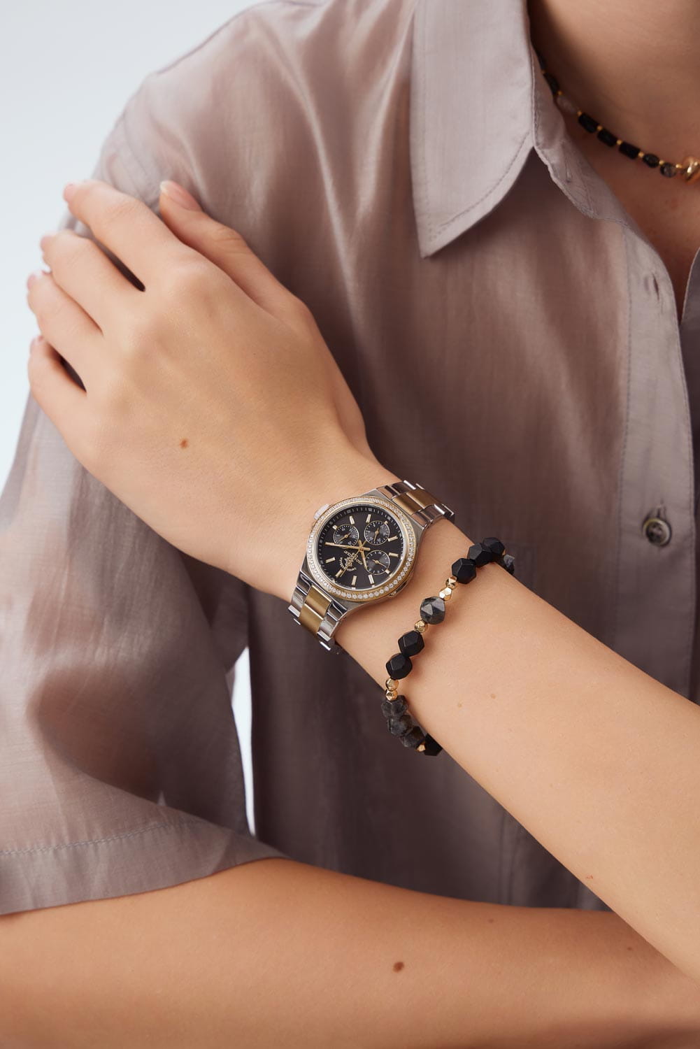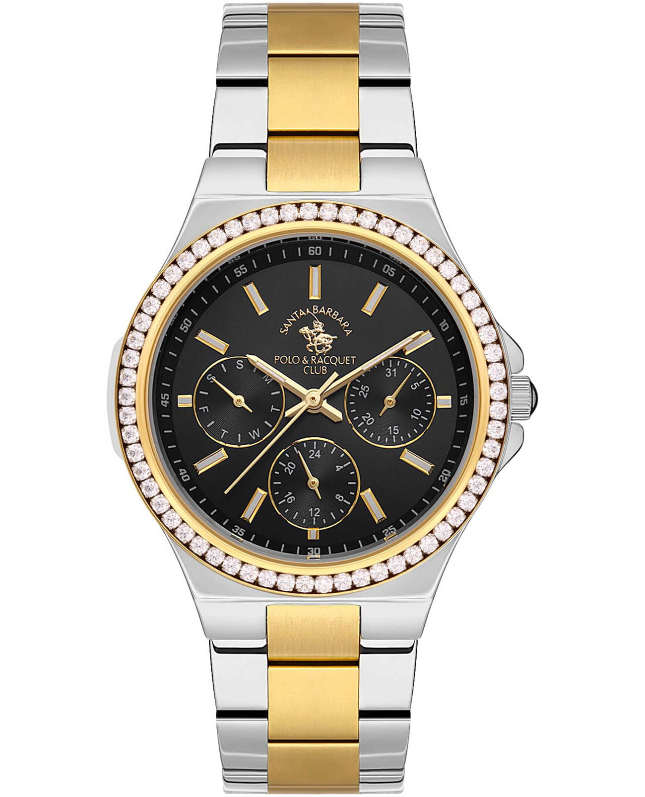 Женские кварцевые часы Santa Barbara Polo & Racquet Club — это функциональный и стильный аксессуар для активной женщины. Корпус диаметром 34 мм и высотой 42 мм выполнен из латуни. Безель с IP-покрытиемIP-покрытиеМетод ионного напыления. Демонстрирует повышенную устойчивость к истиранию, окислению и химическим веществам. Под воздействием высокого давления и температуры около 1500°C молекулы металла надёжно соединяются с частицами корпуса часов. и украшен кристаллами. Циферблат чёрного цвета оформлен по технологии Sunray («солнечные лучи»), дополнен накладными метками в виде штрихов и фирменным логотипом. Указатели дня недели и даты вынесены на отдельные субциферблаты, также присутствует индикация 24-часового формата времени. Стрелки и метки с люминесцентным покрытиемЛюминесцентное покрытиеПозволяет считывать показания времени в темноте. Производители наносят на стрелки, часовые индексы, безель или поверхность циферблата светонакопительный состав, дающий холодное свечение., обеспечивающим хорошую читаемость в темноте. Циферблат защищён минеральным стекломМинеральное стеклоМинеральное стекло представляет собой искусственно выращенный минерал кварца. Такое стекло отличается особой устойчивостью к повреждениям и царапинам. Уступает по некоторым качествам сапфировому стеклу.. Механизм — кварцевый калибр VX3JE1. Часы оснащены стальным браслетом с частичным IP-покрытиемIP-покрытиеМетод ионного напыления. Демонстрирует повышенную устойчивость к истиранию, окислению и химическим веществам. Под воздействием высокого давления и температуры около 1500°C молекулы металла надёжно соединяются с частицами корпуса часов. и раскладной застёжкойРаскладная застёжкаТакой тип застёжки используется только на браслетах из металла. Она никогда не раскрывается полностью, происходит разделение на 2 и более частей. Раскладывающая застёжка снизит вероятность потери часов к минимуму.. Водонепроницаемость 50 м позволяет использовать часы в повседневных условиях. Идеальный выбор для тех, кто ценит стиль, функциональность и качество.