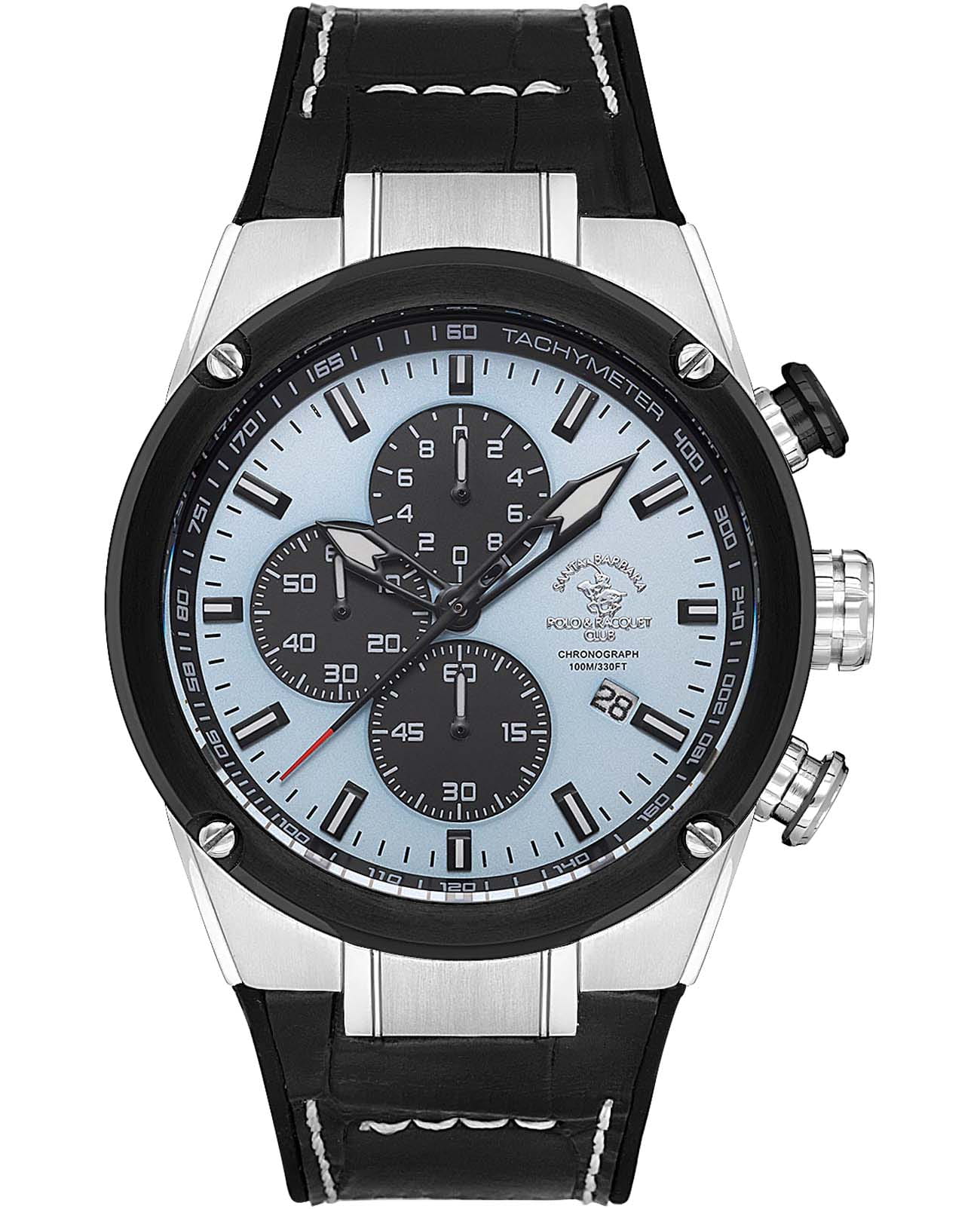Мужские кварцевые часы-хронографХронографФункция позволяет измерять отрезки времени с особой точностью: часы, минуты, секунды. Верным признаком хронографа является наличие на циферблате 3 дополнительных окошек-счётчиков. с секундомеромСекундомерСекундоме́р — прибор, способный измерять интервалы времени с точностью до долей секунды. Santa Barbara Polo & Racquet Club SB.3.10001-2 — воплощение элегантности и технического совершенства. Корпус из нержавеющей стали серебристого цвета, диаметром 45 мм, что делает их устойчивыми к внешним воздействиям и придает благородный вид. Стрелки и метки с люминесцентным покрытиемЛюминесцентное покрытиеПозволяет считывать показания времени в темноте. Производители наносят на стрелки, часовые индексы, безель или поверхность циферблата светонакопительный состав, дающий холодное свечение., обеспечивающим хорошую читаемость в темноте. Неподвижный безельБезельВнешний ободок, закрепляющий стекло. В спортивных часах так называется поворотное кольцо с делениями на циферблате, выполняет роль таймера – замеряет отрезки времени на шкале. Неподвижный безель – элемент декора. Однонаправленно вращающийся безель на дайверских часах позволяет фиксировать моменты погружения и выныривания на поверхность. с IP-покрытиемIP-покрытиеМетод ионного напыления. Демонстрирует повышенную устойчивость к истиранию, окислению и химическим веществам. Под воздействием высокого давления и температуры около 1500°C молекулы металла надёжно соединяются с частицами корпуса часов. черного цвета. Циферблат защищён минеральным стекломМинеральное стеклоМинеральное стекло представляет собой искусственно выращенный минерал кварца. Такое стекло отличается особой устойчивостью к повреждениям и царапинам. Уступает по некоторым качествам сапфировому стеклу. устойчивое к царапинам и механическим повреждениям. Окошко даты находится в положении 4 часа, тахиметрТахиметрРазмеченная шкала, располагается на ободке или безеле часов. Тахиметр позволяет рассчитать скорость на определённом участке пути, расстояние измеряется в километрах или милях. по внешнему краю. Кожаный ремешок на стандартной застёжке обеспечивает комфортное и безопасное ношение. Водонепроницаемость 100 метров позволит плавать, нырять и заниматься другими водными видами спорта. Идеальный выбор для тех, кто ценит элегантный дизайн и качество.