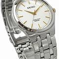 Мужские кварцевые часы Seiko — это надёжный и универсальный аксессуар. Корпус диаметром 34 мм выполнен из нержавеющей стали 316L. Циферблат оформлен индексами и стрелками, включая центральную секундную стрелку. Циферблат защищён прочным закалённым минеральным стеклом Hardlex минеральным стекломМинеральное стеклоМинеральное стекло представляет собой искусственно выращенный минерал кварца. Такое стекло отличается особой устойчивостью к повреждениям и царапинам. Уступает по некоторым качествам сапфировому стеклу.. Механизм — калибр 7N01 с высокой точностью хода (±10–15 сек. в месяц). Часы оснащены стальным браслетом на тройной раскладной застёжкеРаскладная застёжкаТакой тип застёжки используется только на браслетах из металла. Она никогда не раскрывается полностью, происходит разделение на 2 и более частей. Раскладывающая застёжка снизит вероятность потери часов к минимуму. с фиксатором. Водонепроницаемость 50 м позволяет использовать часы в повседневных условиях. Идеальный выбор для тех, кто ценит японское качество и классический дизайн.
